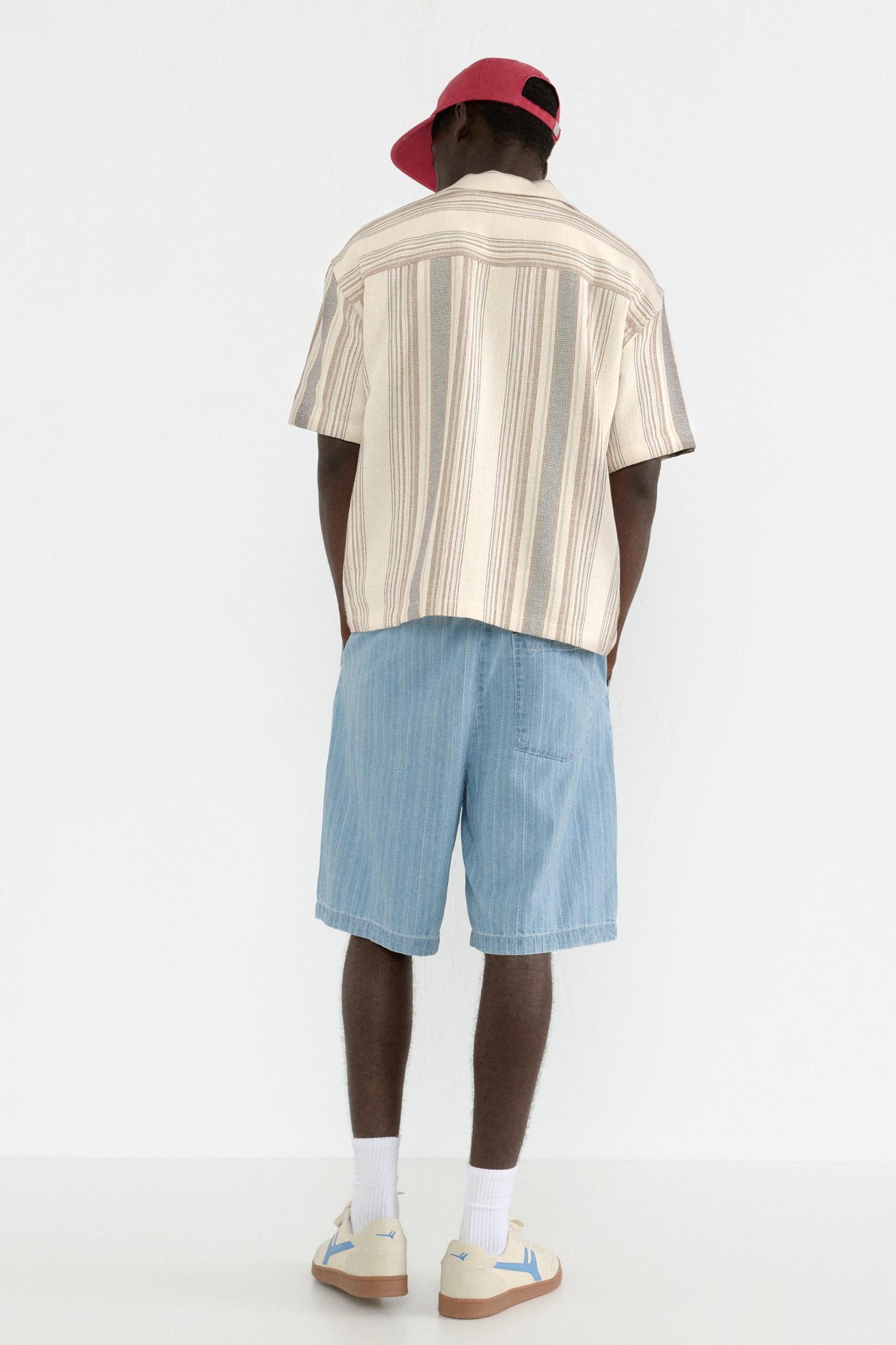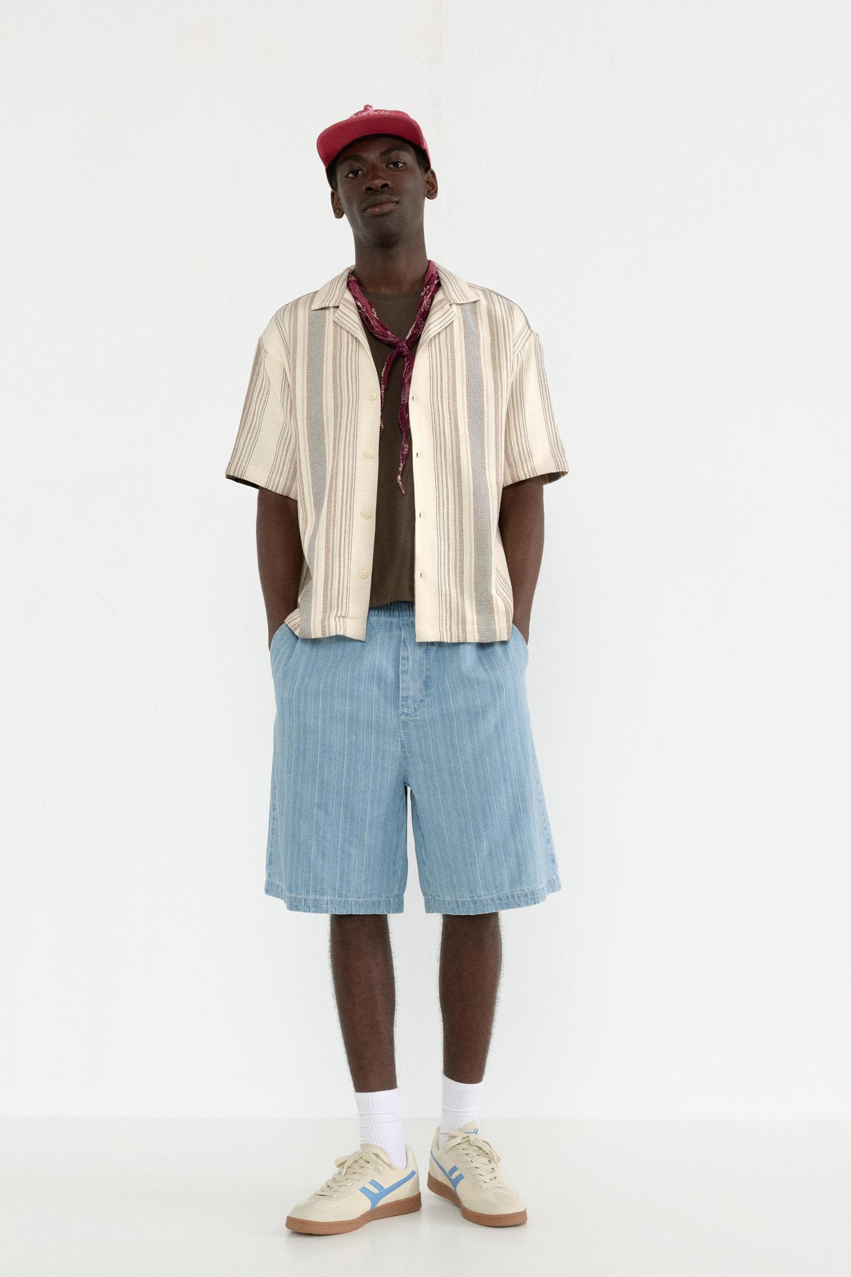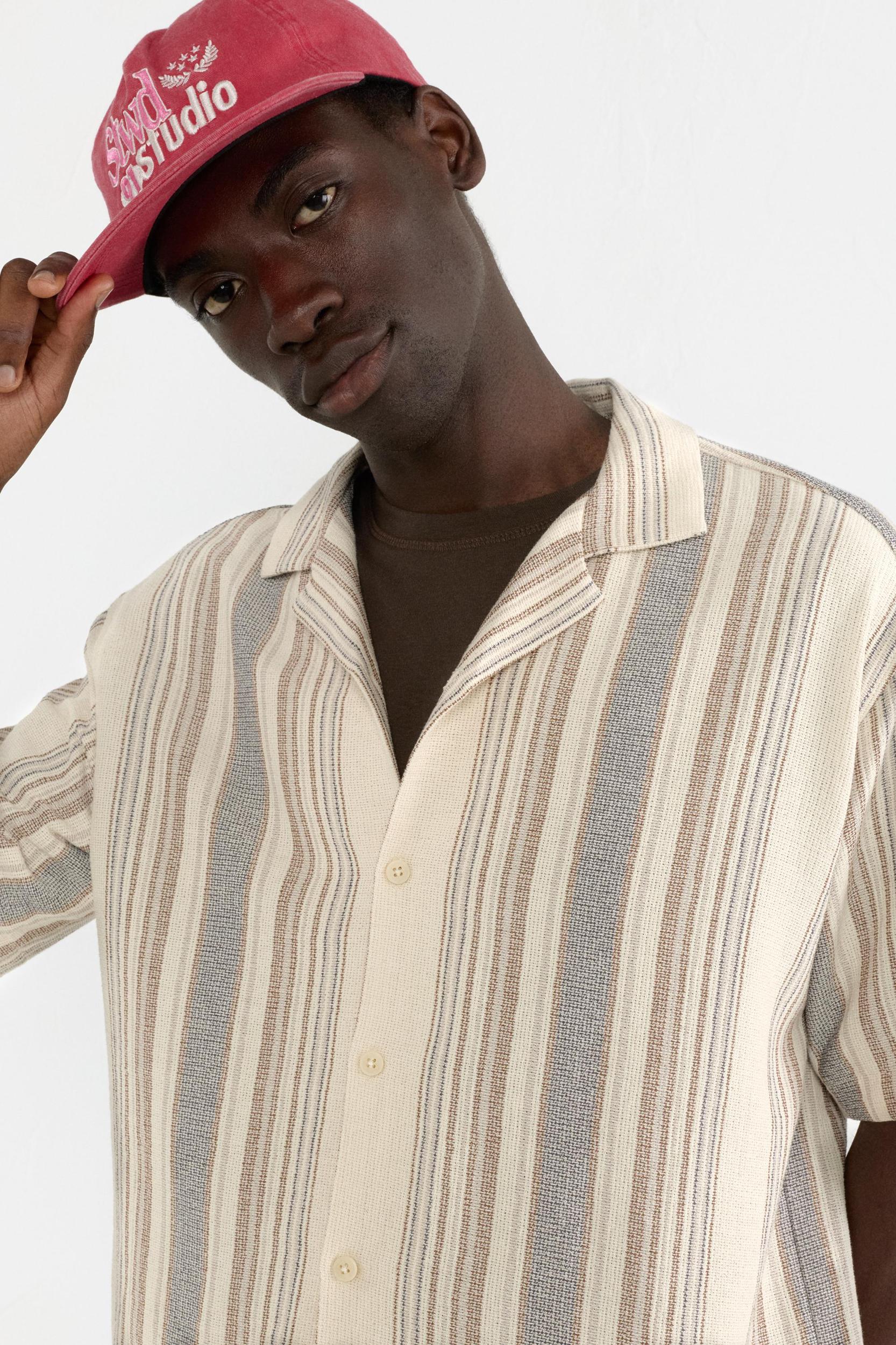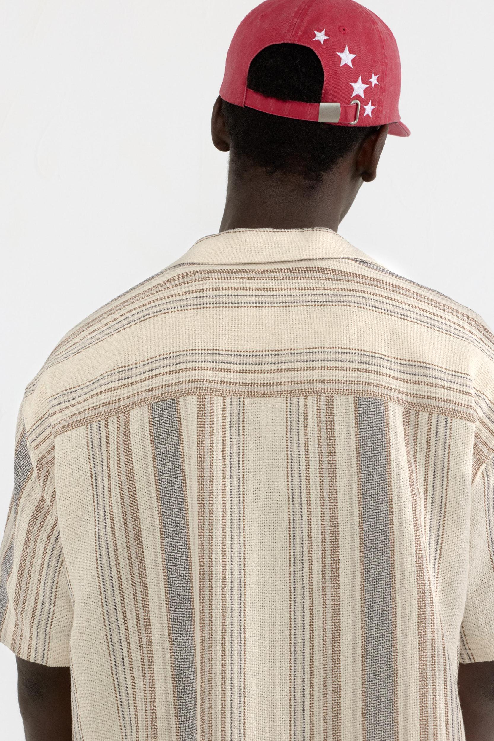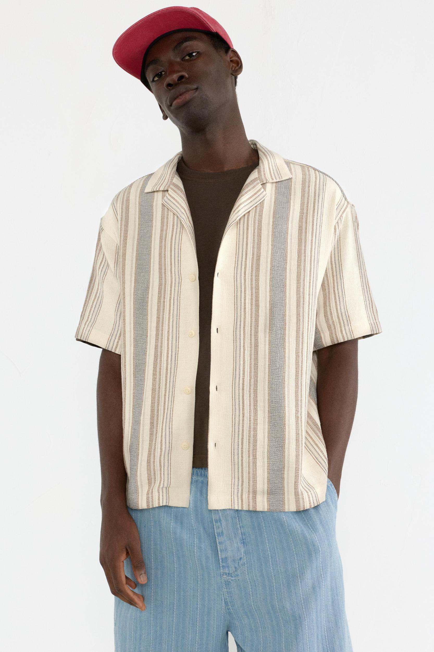 Rustic short sleeve shirt with a striped design, button-up front and lapel collar. Made of 100% cotton.