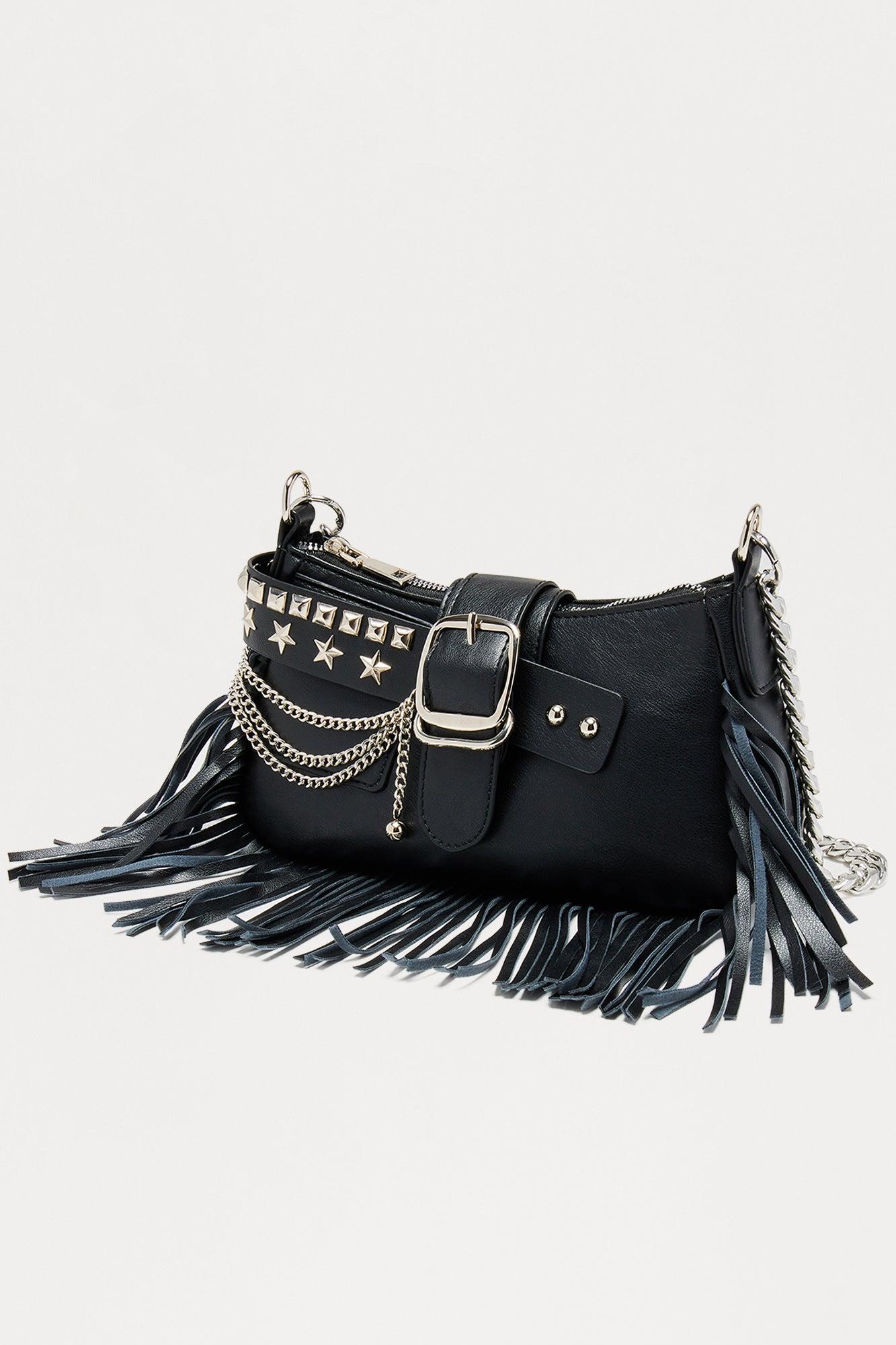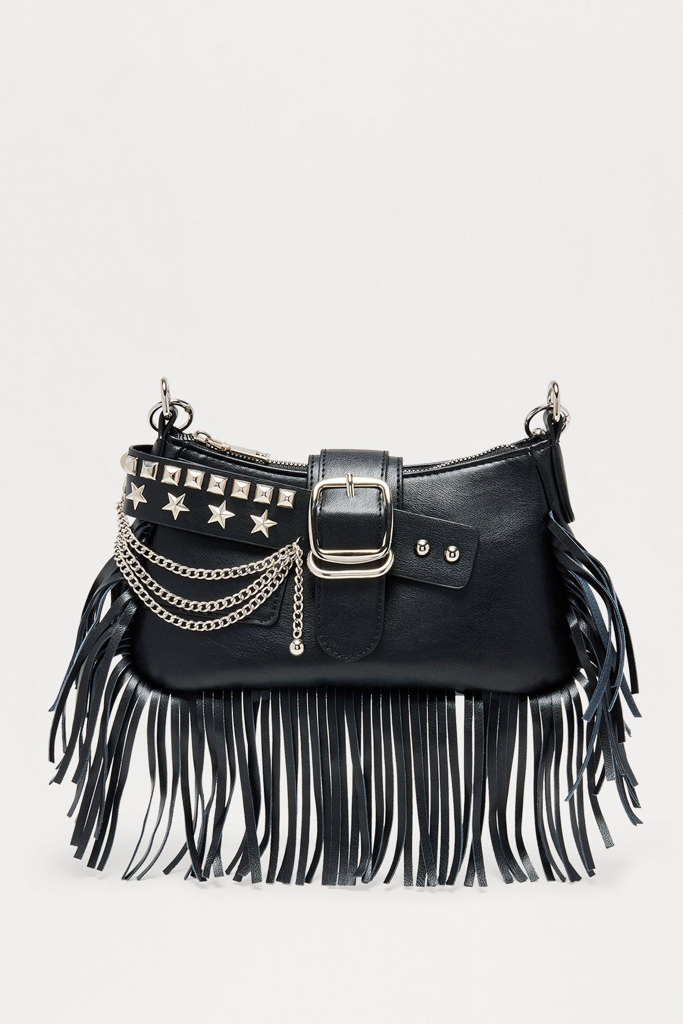 Available In Black. Shoulder Bag Faux Leather Studded Fringe Trim Top Zip Closure Hardware Detail Dimensions: 9"3"5" Imported California Proposition 65WARNING: Cancer and Reproductive Harm - www.P65Warnings.ca.gov.