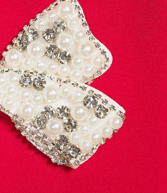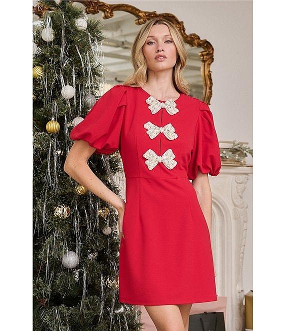 From Sugarlips, this dress features: Stretch crepe fabrication Crew neckline Short puff sleeves Center back zipper closure Pearl bow detail Cut out detail Mini length Approx. 34" length Self: polyester/spandex Lining: polyester Hand wash Imported.