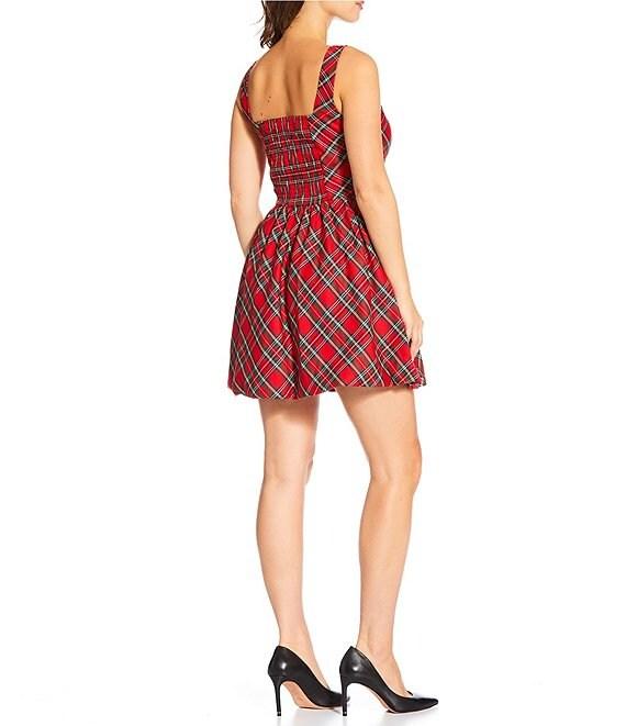 From Sugarlips, this dress features: Fit & flare silhouette Plaid print Square neckline Sleeveless Wide straps Smocked back panel Velvet bow detail Pleated bubble hemline Side zip closure Approx. 34" length Self: Polyester Lining: polyester/spandex Hand wash Imported.