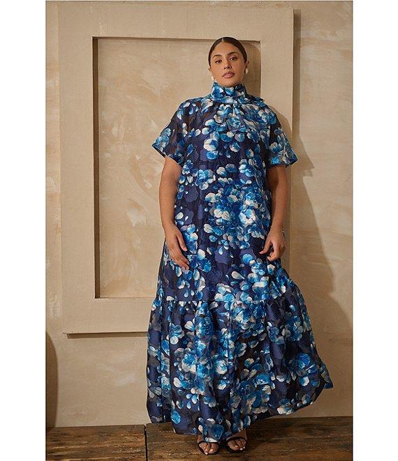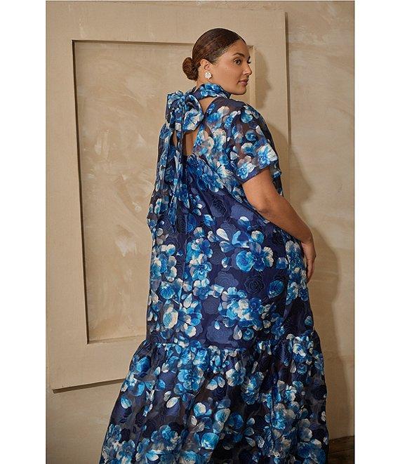 From Sugarlips Plus, this dress features: Floral jacquard organza fabric Mock neckline Short sleeves Cutout back with bow detail Long, full ruffle-tier skirt Pullover styling Self of polyester jacquard/organza; lining of polyester Hand wash/line dry Imported.