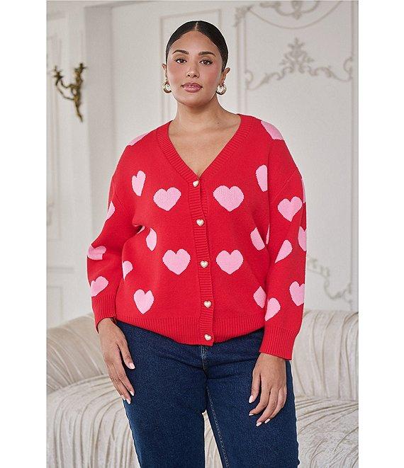 From Sugarlips Plus, this cardigan features: Sweater knit fabrication Heart printed V-neckline Long sleeves Button front closure Cardigan silhouette Pearl heart shape button detail Approx. 26.25" length Viscose/polyester/polyamide Hand wash Imported.