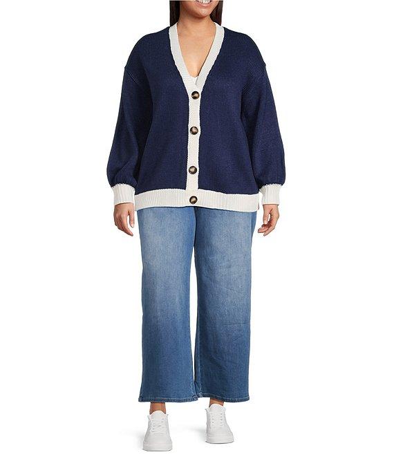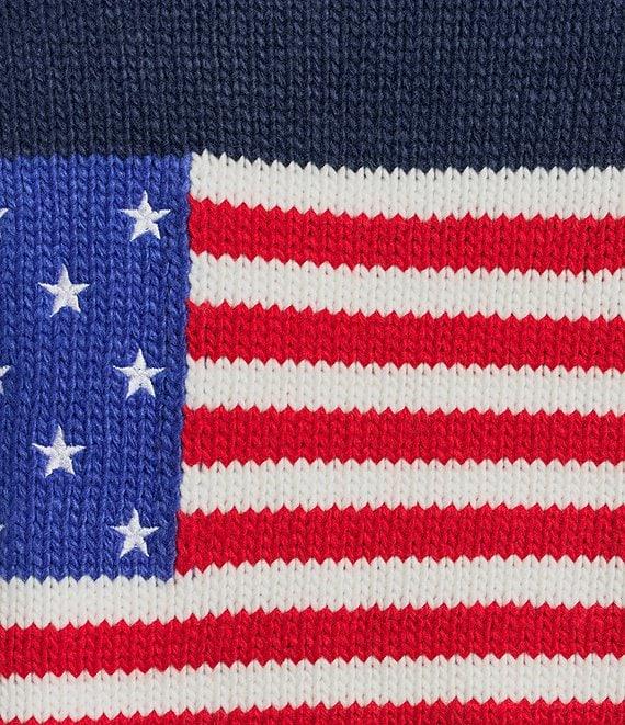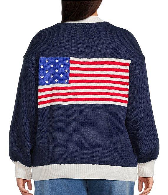From Sugarlips Plus, this cardigan features: V-neckline Long sleeves Button front closure Cardigan silhouette American flag graphic at back Contrast rib at hem, center, and cuff detail Approx. 29" length Acrylic Hand wash Imported.