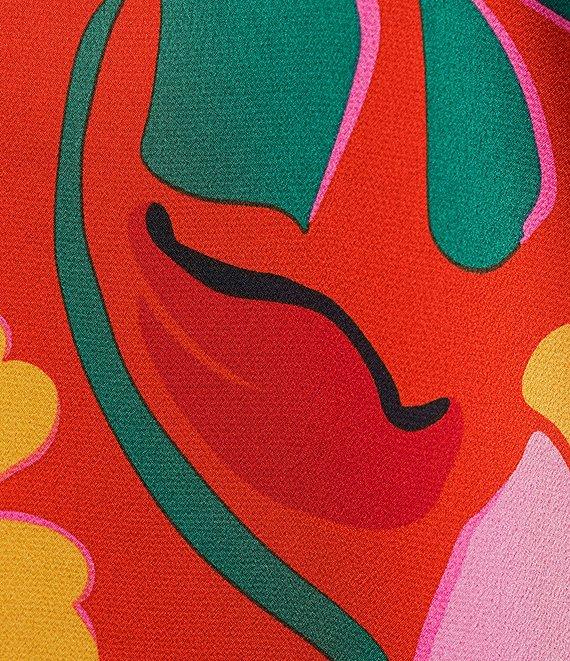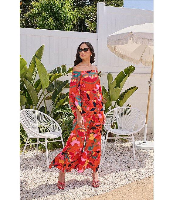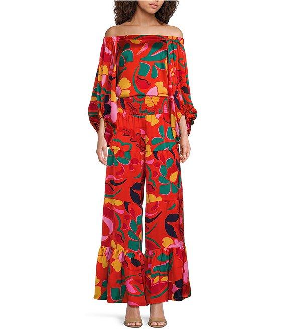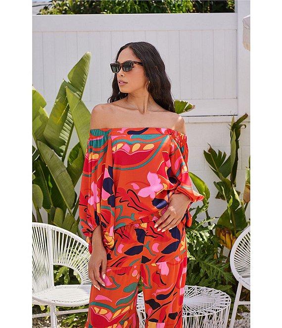 Sugarlips Satin Tropical Abstract Print Off The Shoulder Neck Long Sleeve Coordinating Top