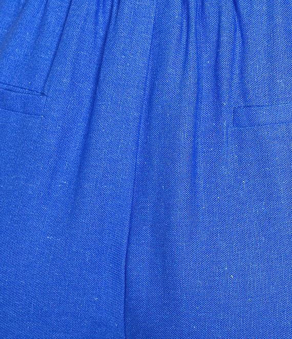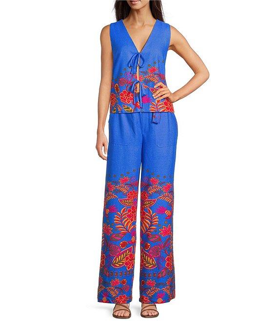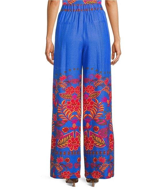 From Suagrlips, these pants feature: Tropical border print High-rise waistline Wide leg silhouette Pull on construction Front patch pockets Lined Attached faux belt in the front Elasticized waistband in the back Approx. 31" inseam Self: rayon/linen Lining: cotton Hand wash Imported.