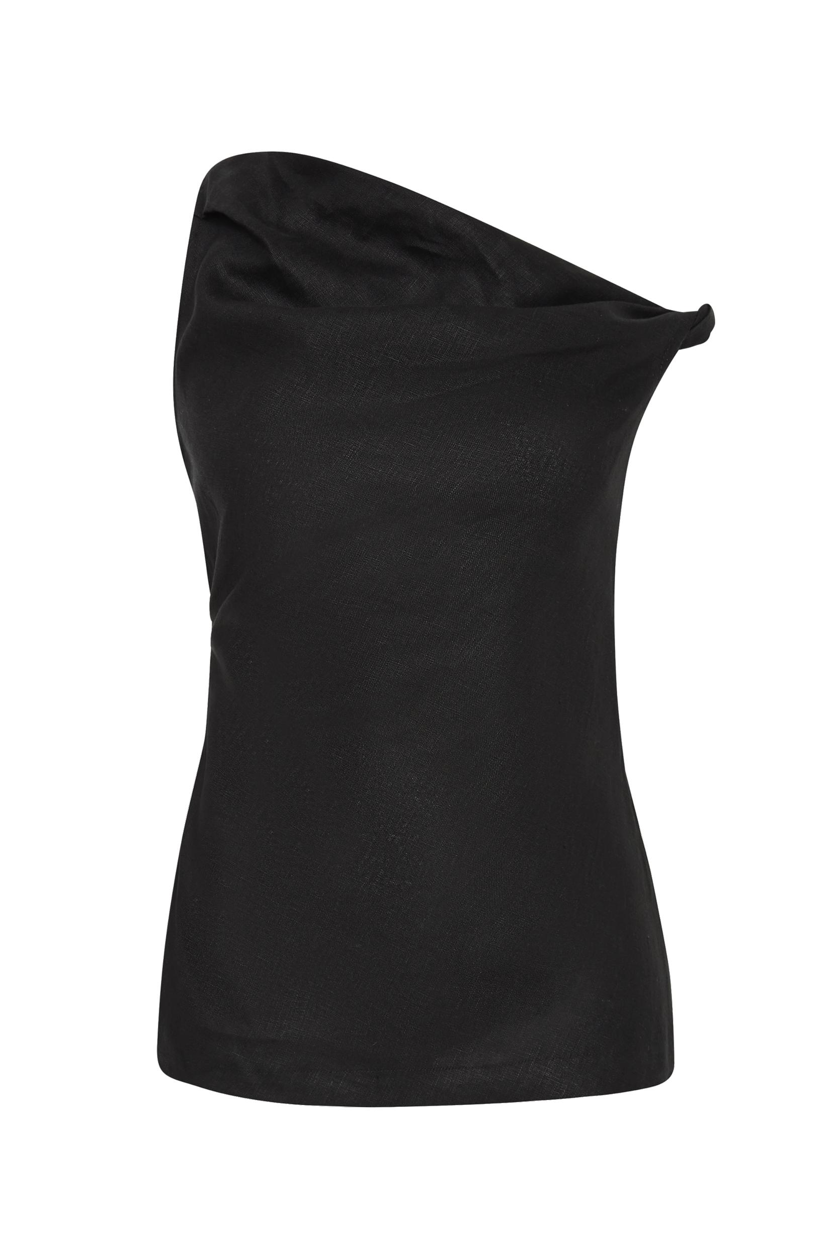 A timeless top, designed from a signature 100% European Flax® linen fabrication in a classic black. It features an asymmetric one-shoulder neckline with gathering and drape details across the front bodice. Cinching in slightly at the waist, it is a relaxed silhouette that flares out slightly to fit around the hips. Style over the Suis Skirt for effortless yet elevated occasionwear year round.This style is true to size. There is no elastic woven into the fabric so it does not offer any additional stretch.