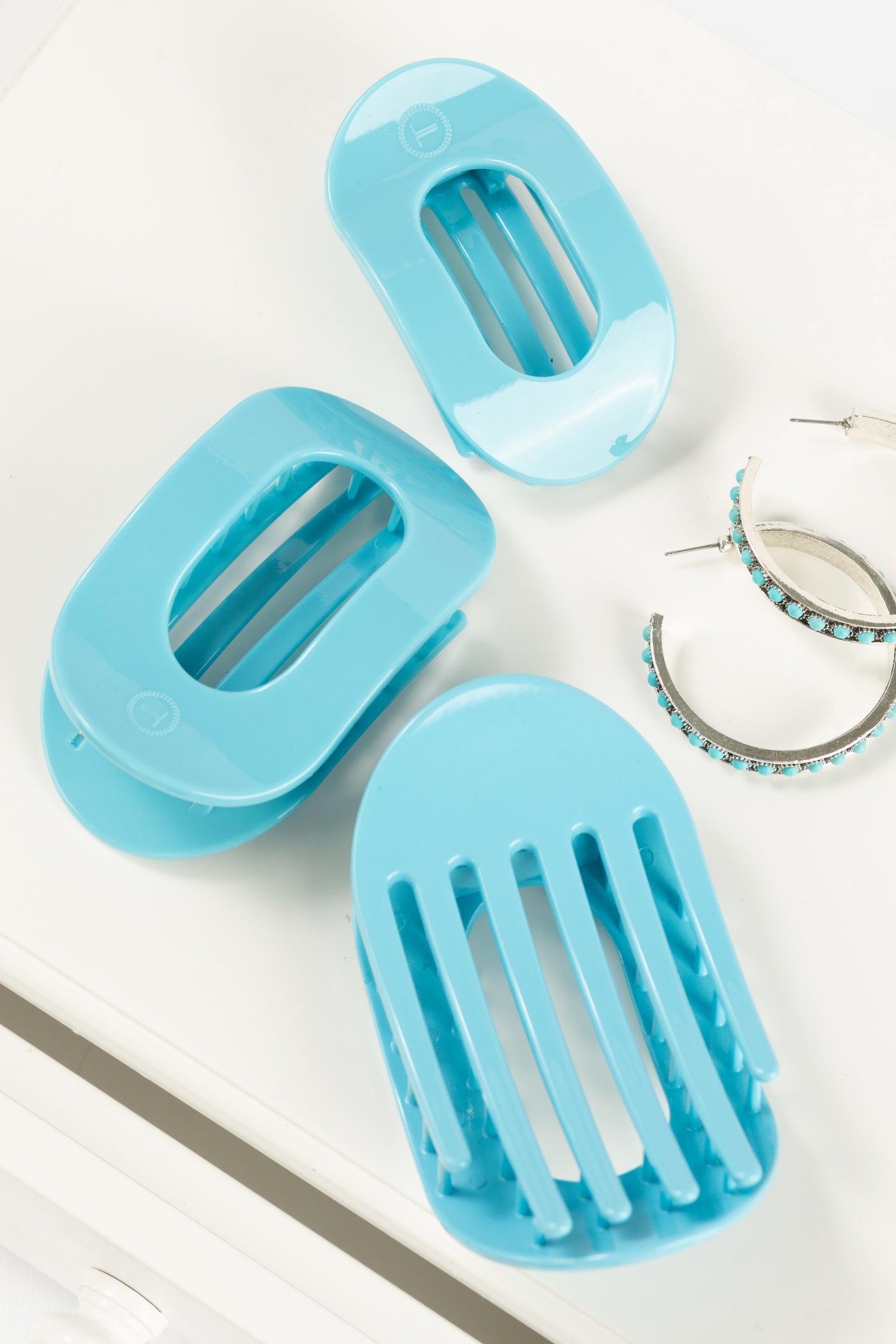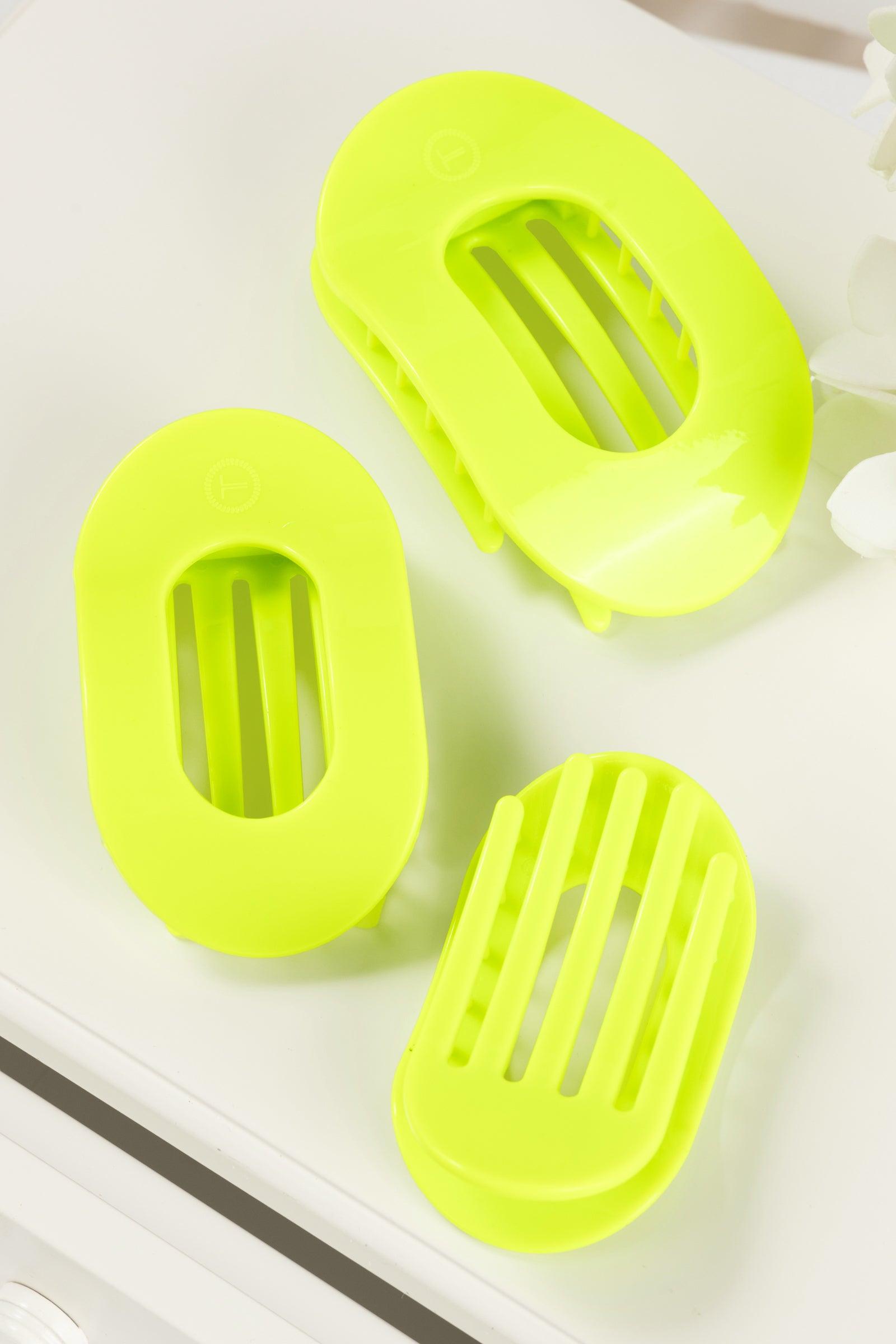 Product Details Colors: Summer Sky (Sky Blue)/ Tropical Punch (Hot Pink)/ Summer Brights (Neon Yellow Green) Other Details: This hair clip is designed to allow you to lay back flat, do yoga, or sit comfortably in a seat with a headrest, and it is made with the same material that is nearly unbreakable. Lay down flat with comfort Bendable teeth for a secure yet gentle hold Lightweight, durable, and hair-friendly Perfect for all-day wear—from sunup to sundown The small size is suitable for thin to medium hair types, whether worn up or half-down. Medium clips are great for thick to medium thickness of hair. The large size is great for thick hair. Brand: Teleties Size and Fit Small: 3.25" Medium: 3.75" Large: 4.25"