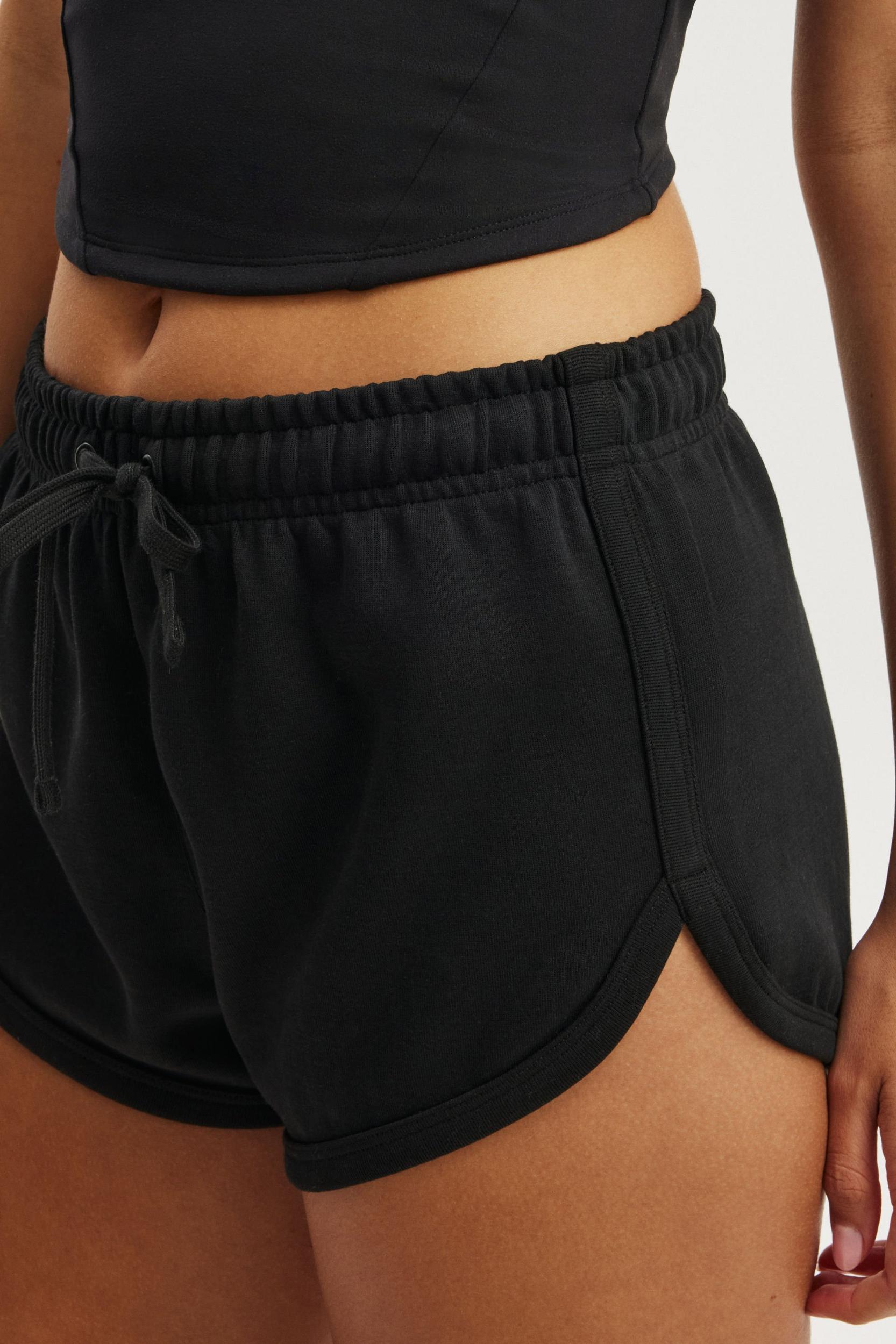Comfortable fitted retro style gym short ,High rise ,Shortie leg length ,Internal elasticated waistband with functioning external drawcord ,Summer Fleece, double faced fabrication, perfect for summer lounging ,Lightweight and breathable