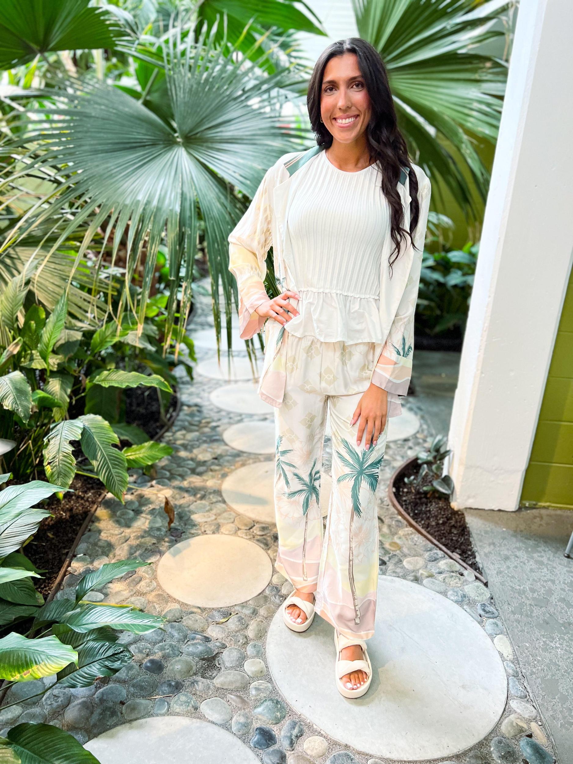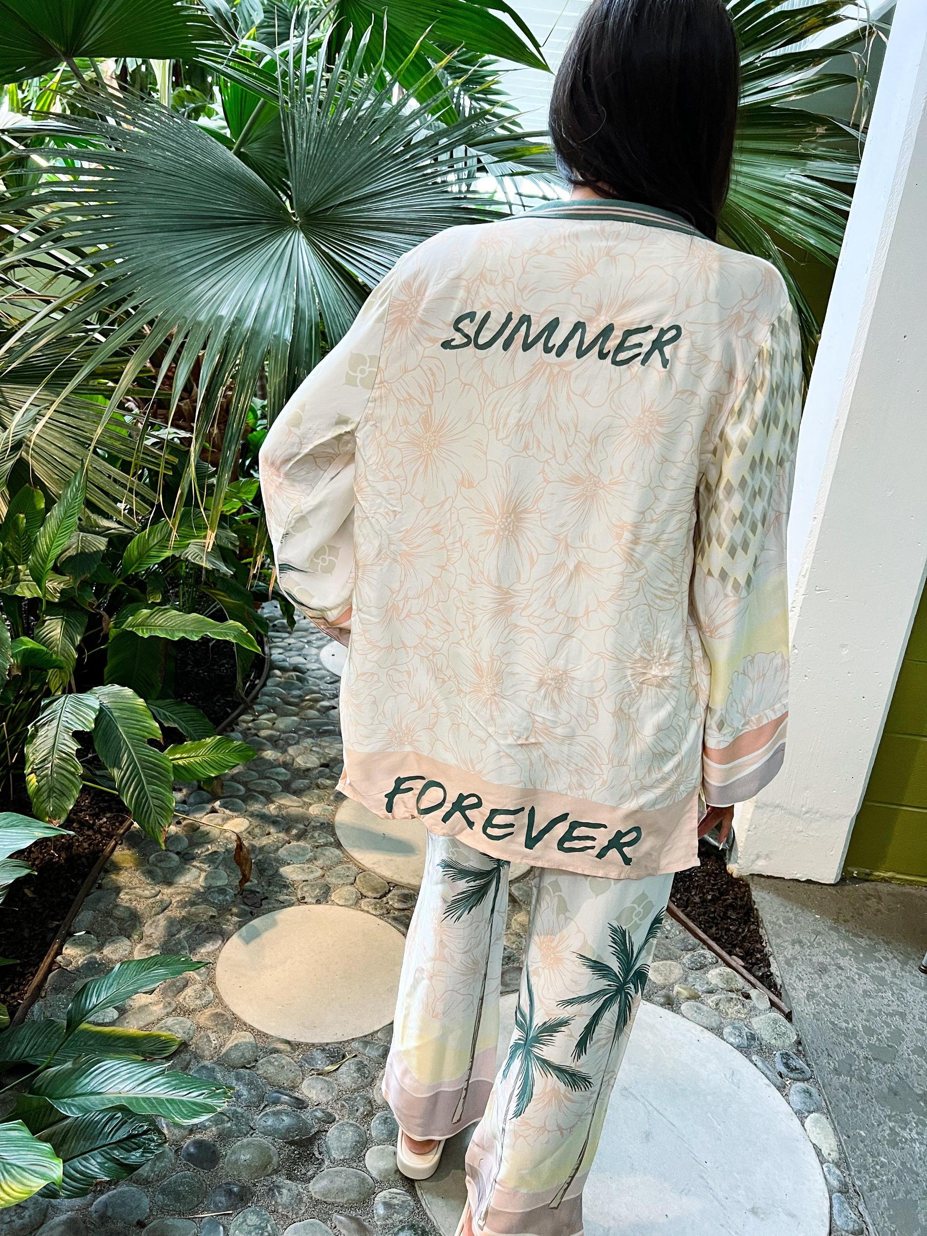 Get ready for a trip to paradise with our Summer Paradise Satin Printed Blazer! Made with a flowy fit, this blazer is perfect for the beach and features a playful "summer forever" back graphic. Embrace the tropical vibes with this must-have piece!