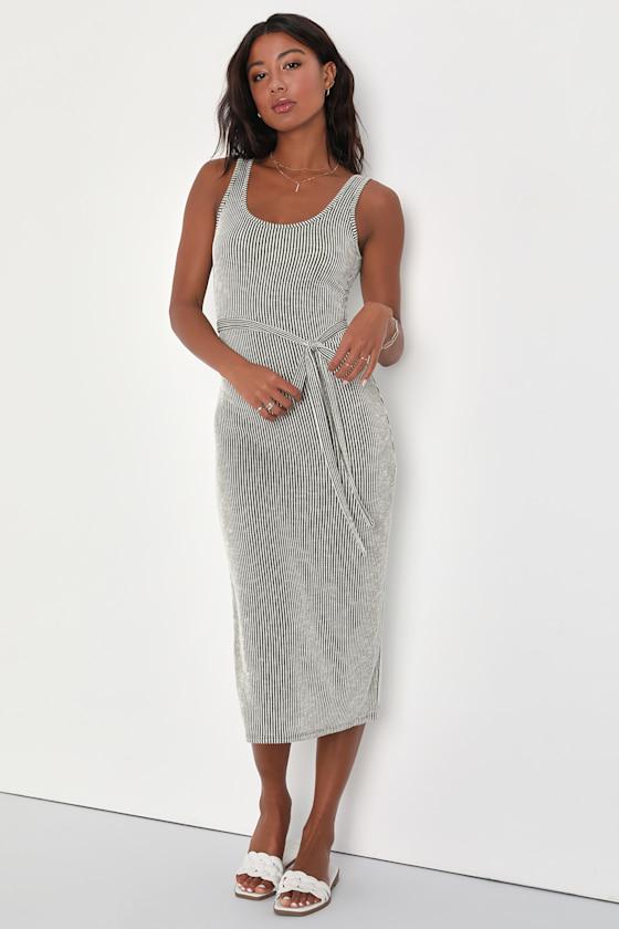 A relaxing, sunset patio date calls for cold bevs and the Lulus Summer Perfection Olive and Ivory Striped Ribbed Midi Dress! Soft and stretchy ribbed knit, with an ivory and olive striped design throughout, shapes this casually cute dress that has tank straps, a scoop neckline, and a fitted bodice. The figure-skimming silhouette boasts a tying sash belt before falling to a column skirt that ends at a midi hem. Kick pleat at back creates a flirty finish!