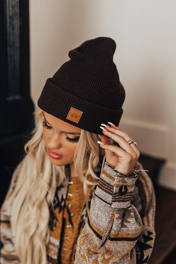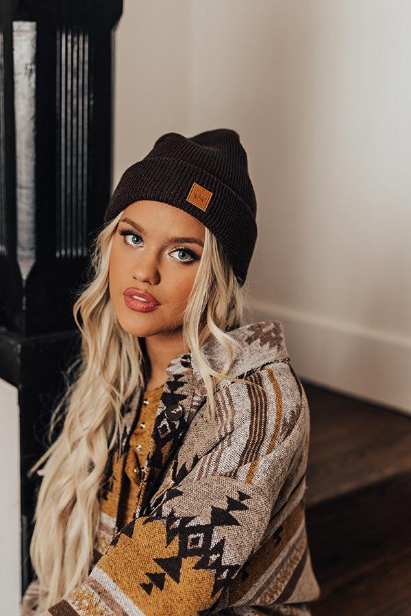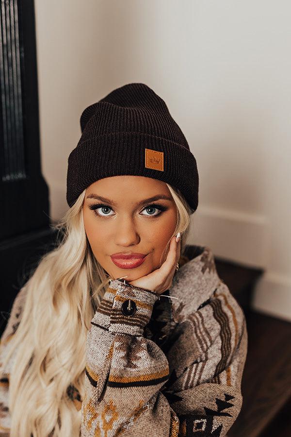Keep the chill out when the sun goes down with this cute espresso colored beanie featuring stretchy and warm knit material lined with fleece and a rolled hemline!