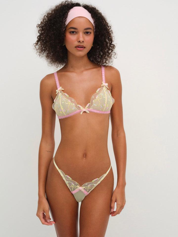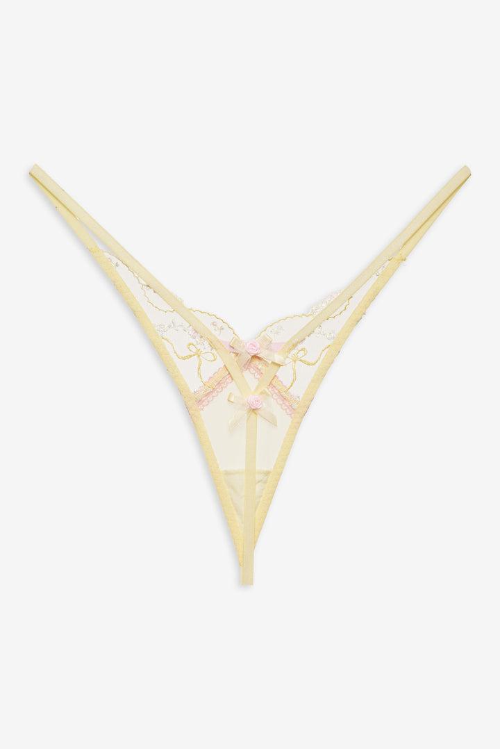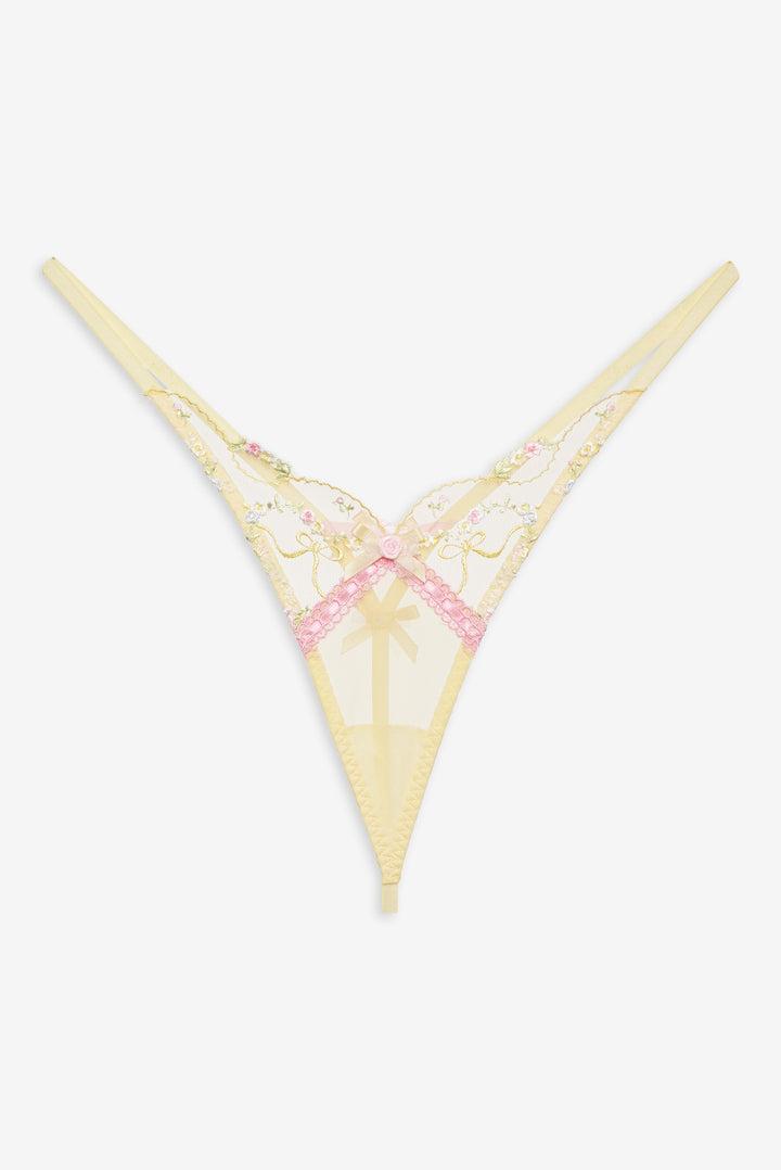 Celebrate the art of feminine charm in the Sunny Bouquet yellow thong–a satin panty adorned with floral heart and bow embroidery, plus an elegant slotted ribbon trim. Spotlighting rosette topped bow appliqués and g string back coverage, this yellow panty was crafted for basking in sunlit gardens.