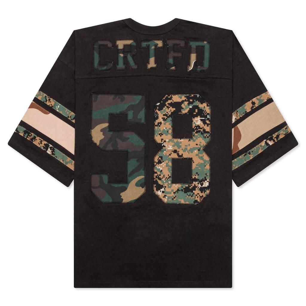 Combining the worlds of fashion and nature, CRTFD designs garments with an artisanal feel. The Super Gore Jersey is made with a football-inspired silhouette and constructed from 100% organic cotton. Using vintage military fabrics, the camo details are unique and elevates the casual jersey. THIS PRODUCT MIGHT SHOW NATURAL SIGNS LIKE WRINKLES, SCARS, AND SCRATCHES, WHICH ARE PART OF THE MATERIAL'S CHARACTER. EACH PIECE IS UNIQUE, INCLUDING POSSIBLE VARIATIONS IN THE GRAPHIC PATTERNS DUE TO THE NATURE OF THIS PRODUCT, ALL SALES ARE FINAL. V-neckline Straight hem Each garment is unique Vintage applique Style No: 0937FSB