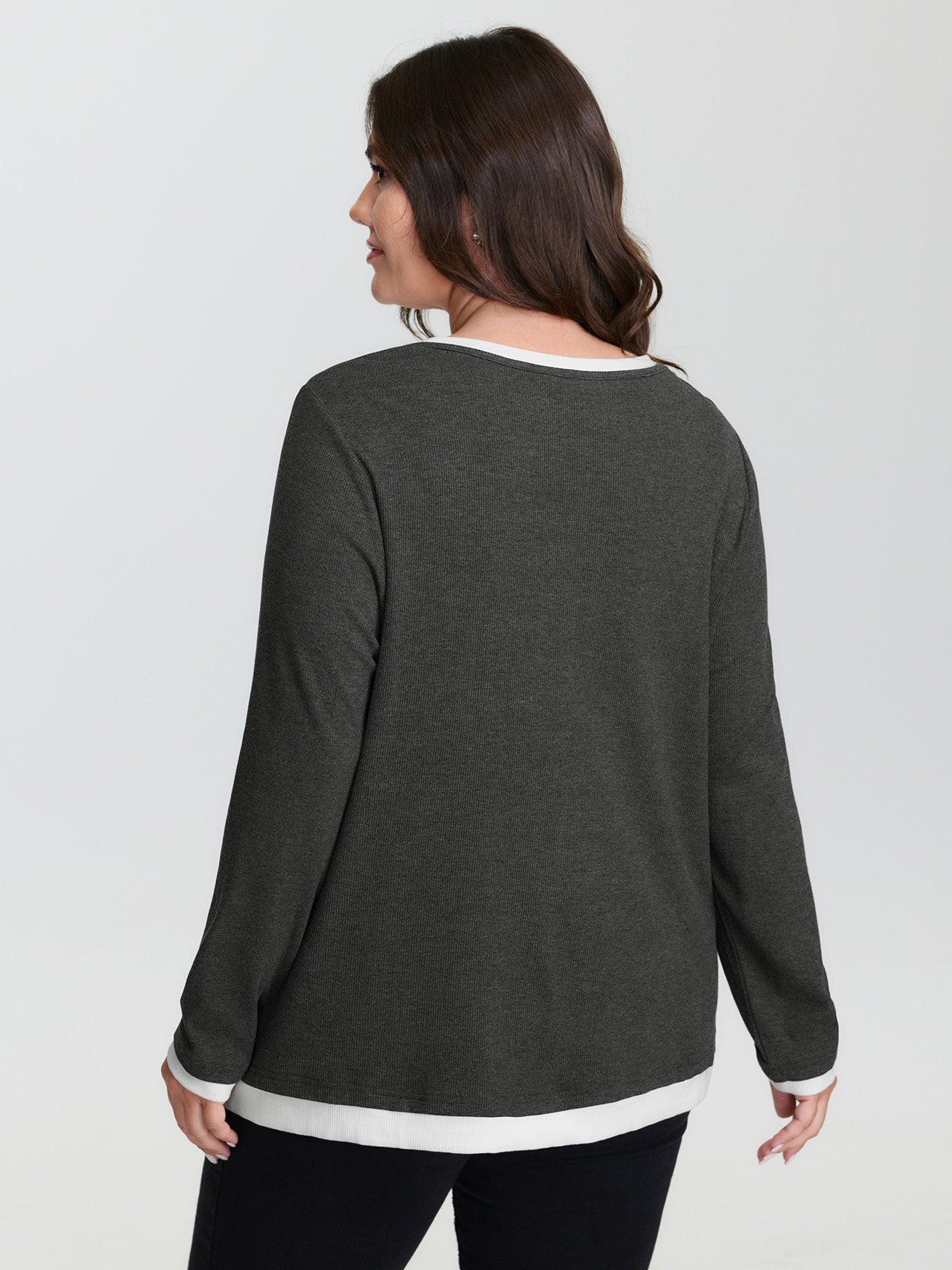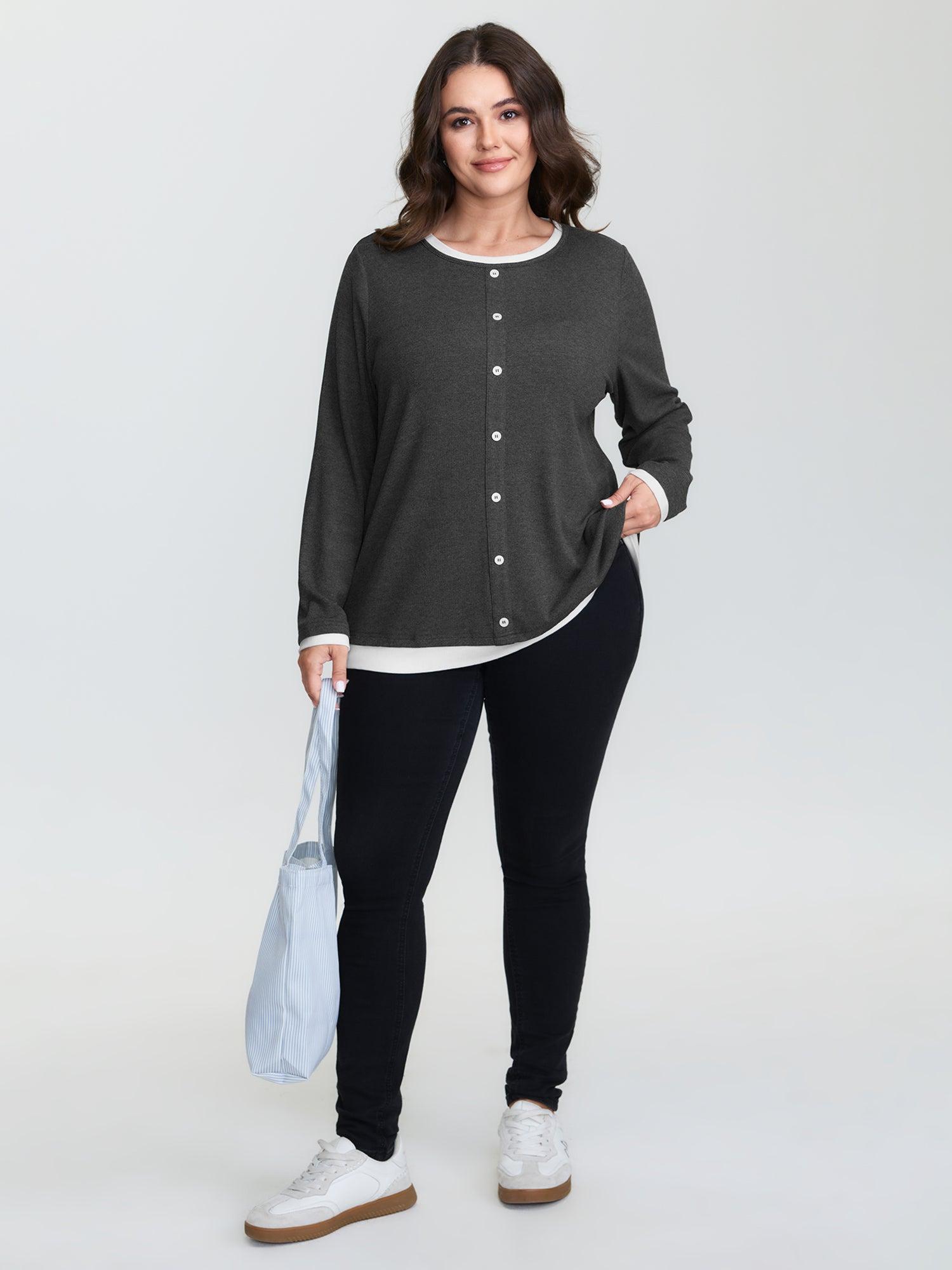 Shop Supersoft 2-In-1 Color Contrast T-Shirt now and redefine your style with confidence at BloomChic. Tailored for mid and plus-size women. This trendy Tops Women, sizes 10-30. Color:DimGray;Style:Leisure;Prints:Non;Neckline:Round Neck;Sleeve Type:Regular Sleeve;Details:Button, Contrast;Pocket:No-pocket
