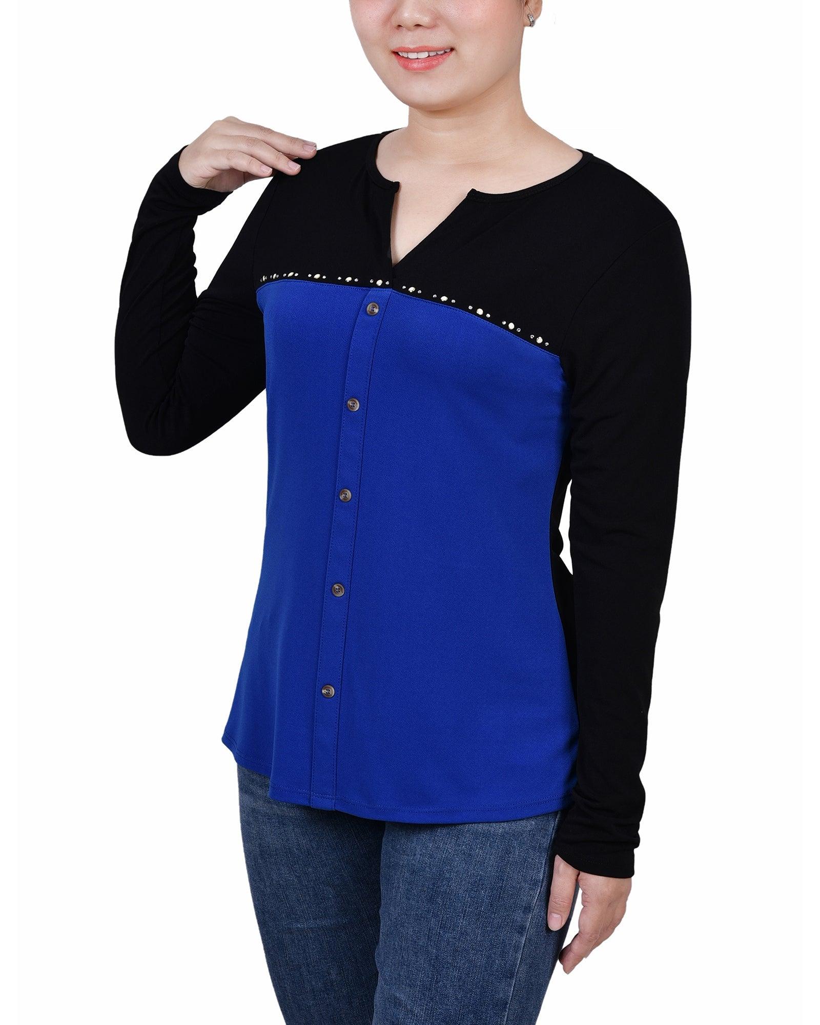 Surf The Web Long Sleeve Studded Colorblocked Split Neck Top