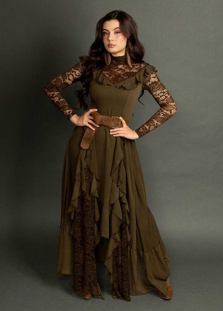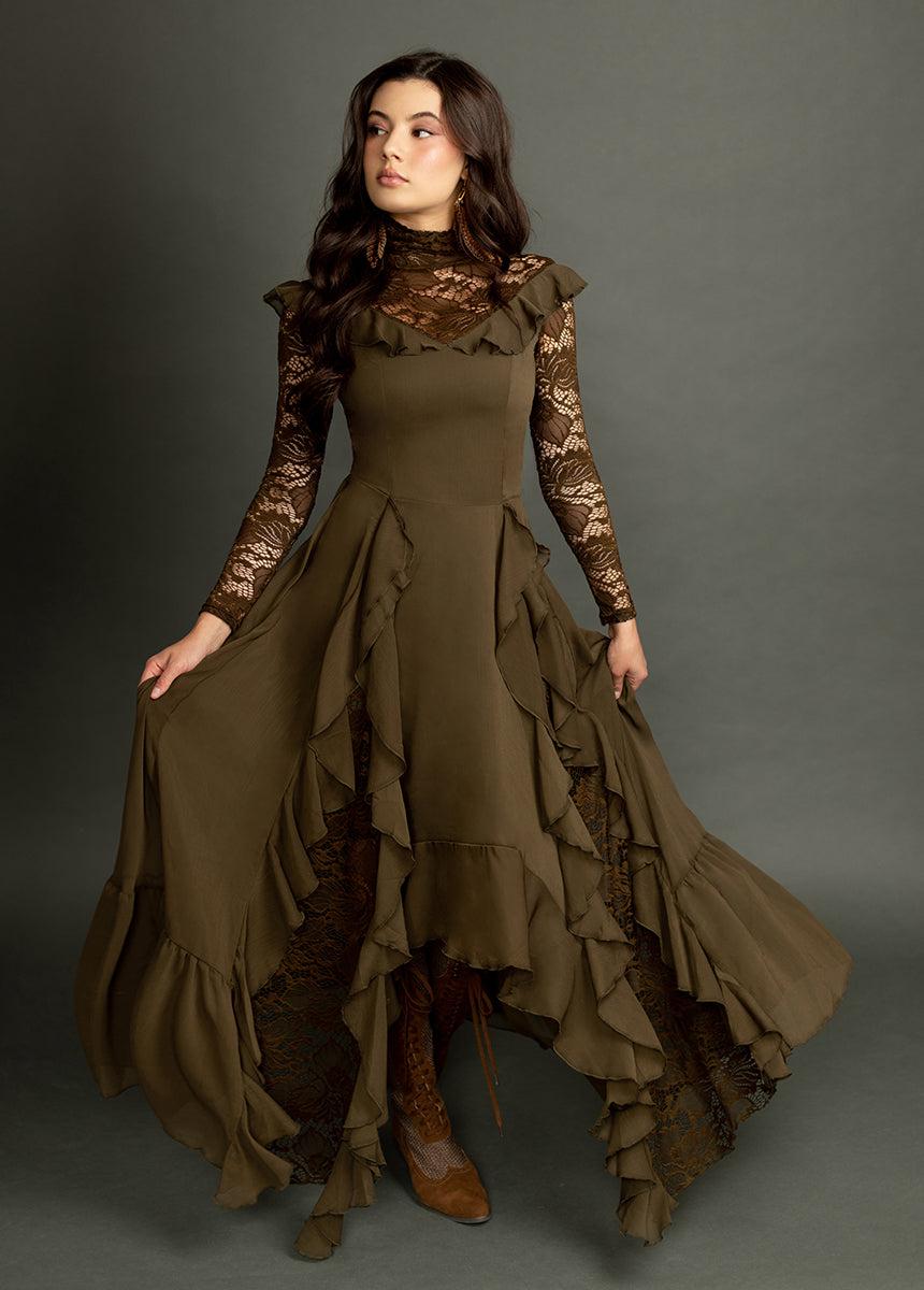 Elevate your wardrobe with our Sveta Dress, inspired by the timeless elegance of the classic Cass Dress. This sophisticated maxi dress blends classic style with a touch of whimsy, making it perfect for any special occasion. Featuring delicate, boho ruffle princess seams, this dress enhances your silhouette while adding playful charm to your look. The lace turtleneck and sleeve detailing further elevate its stunning appearance, offering a refined and enchanting touch. Stretch lace Lace gussets Turtleneck collar Ruffle princess seams Ruffle neckline & backline Lace trim details Keyhole at back Invisible side seam zipper High-low hem Half bodice & half skirt lined Functional covered buttons at back-neck Self: 100% Polyester // Lace: 90% Nylon, 10% Spandex Hand wash only, line dry Model is 5'5 wearing an XS