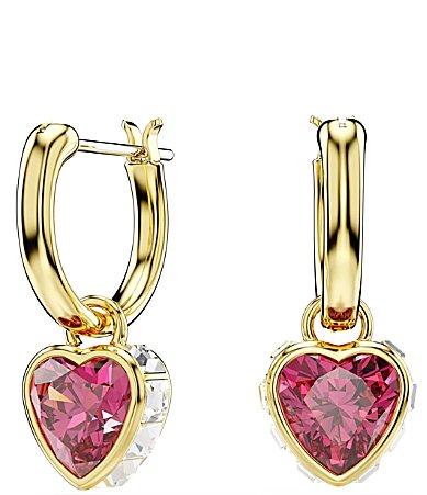 From Swarovski, the Chroma Crystal Heart Drop Earrings feature: Chroma drop earringsHeart, red, gold-tone plated Mini hoop with a removable heart-shaped motifMade from red Swarovski zirconiaClear square crystals around the edgesApprox. Size: 0.79 x 0.31Backing: posts/hoop hingeImported.