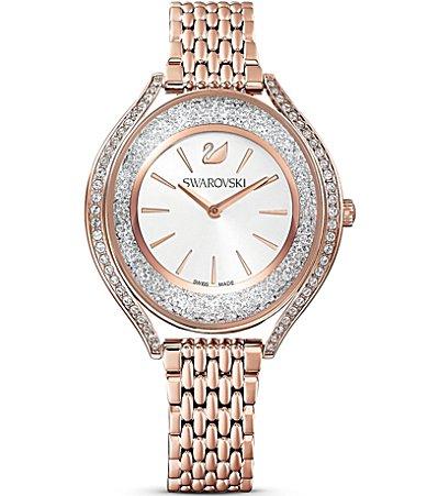 From Swarovski, the Crystalline Aura Rose Gold Bracelet Watch features: Rose gold-tone metal braceletRose gold-tone caseMore than 1,300 crystals in the champagne-gold tone PVD caseWhite dialButterfly closureQuartz analog movementSwiss MadeCase size approx. 34mm Water-resistant up to 50MImported.