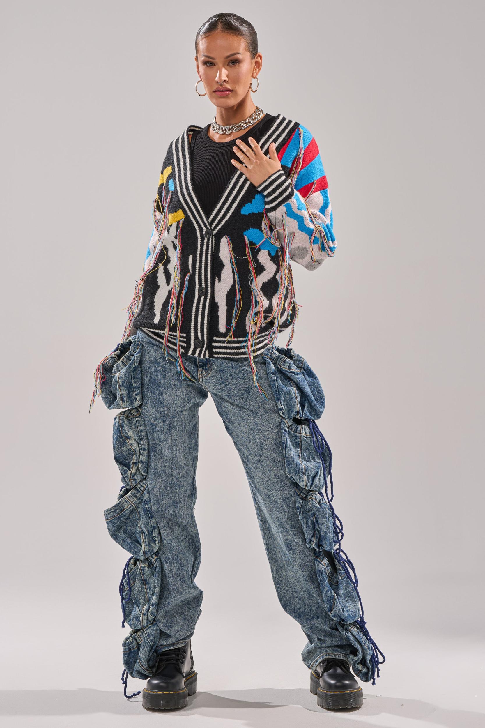 It’s that time of year… The AKIRA Label Sweater Weather Cardigan is crafted from a cozy knit fabric with an abstract figure pattern in electric, colorful hues. It features a deep V-neckline, striped ribbed trim on the hemlines and cuffs, playful fringe yarn detailing scattered throughout the front, and button front closures. Complete with a relaxed, oversized fit. - 42% Viscose 30% Polyester 28% Nylon- Hand Wash Cold- Some Stretch- Imported (all measurements approximate from size S/M)- 26” Shoulder to Hem- 23” Shoulder to Shoulder- 17” SleevesProduct ID: 1068537 (all measurements approximate from size 1X/2X)- 28” Shoulder to Hem- 25” Shoulder to Shoulder- 18” SleevesProduct ID: 1068539