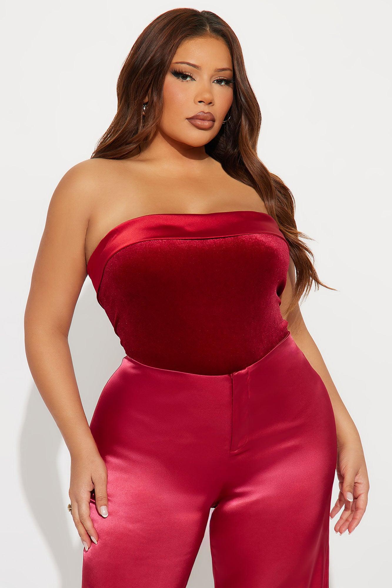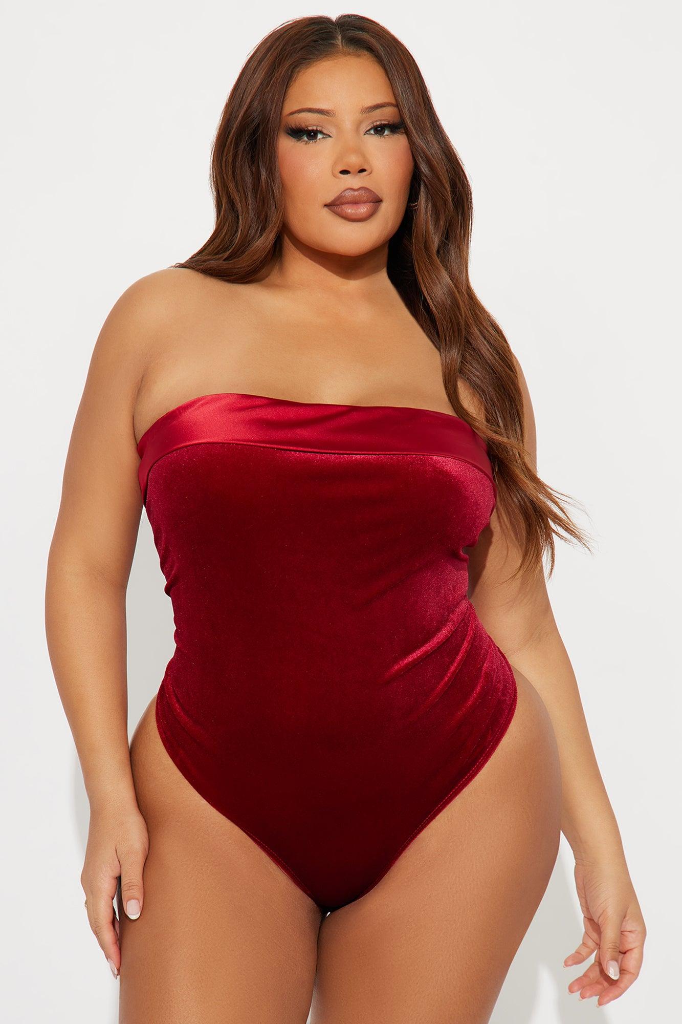 Available In Black/White, Green And Red. Velvet Bodysuit Strapless Straight Neckline Folder Over Detail Grip Tape Lined Thong Bottom Snap Button Closure Stretch Final Sale Self: 95% Polyester 5% Spandex Contrast: 95% Polyester 5% Spandex Imported