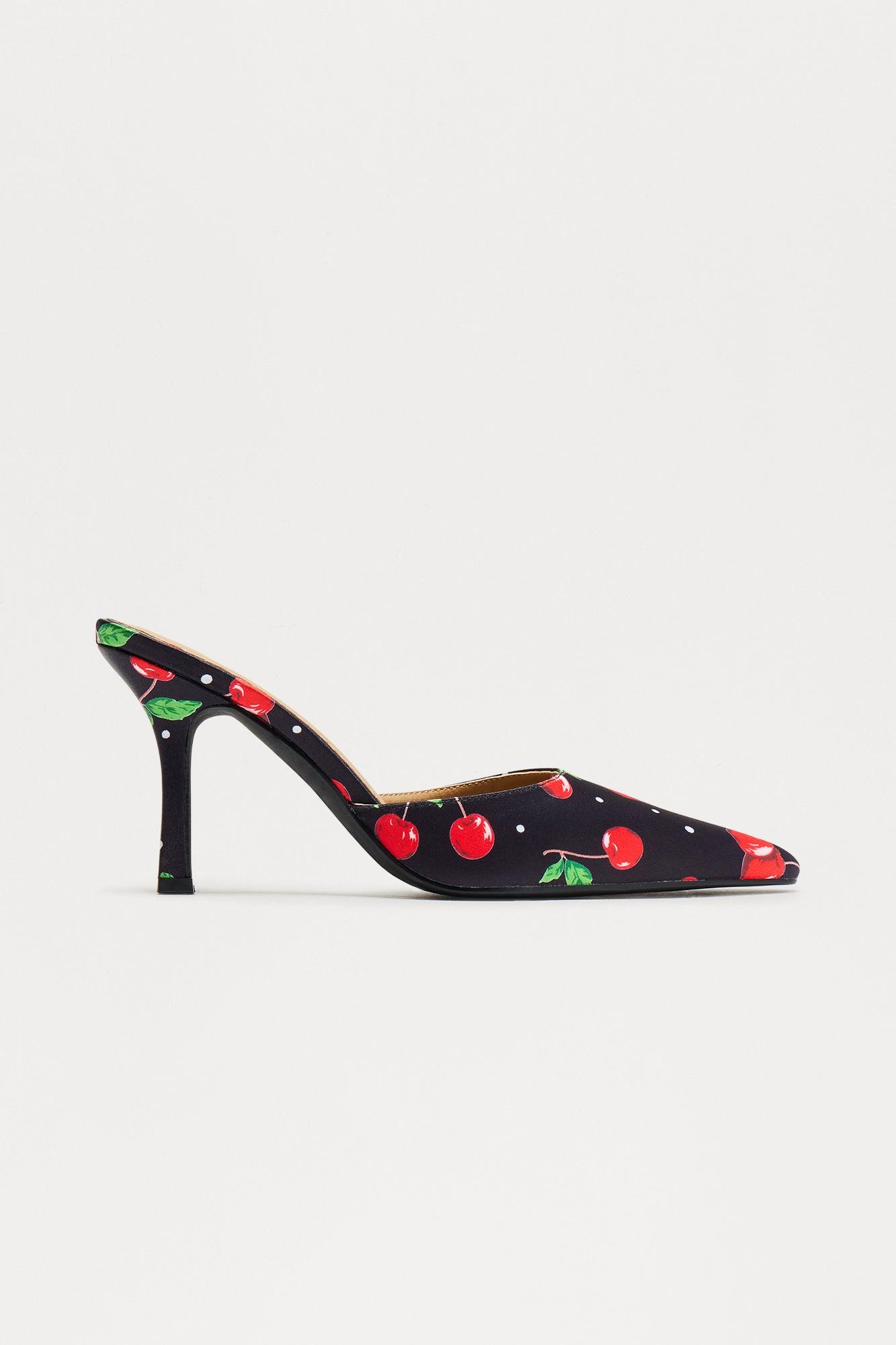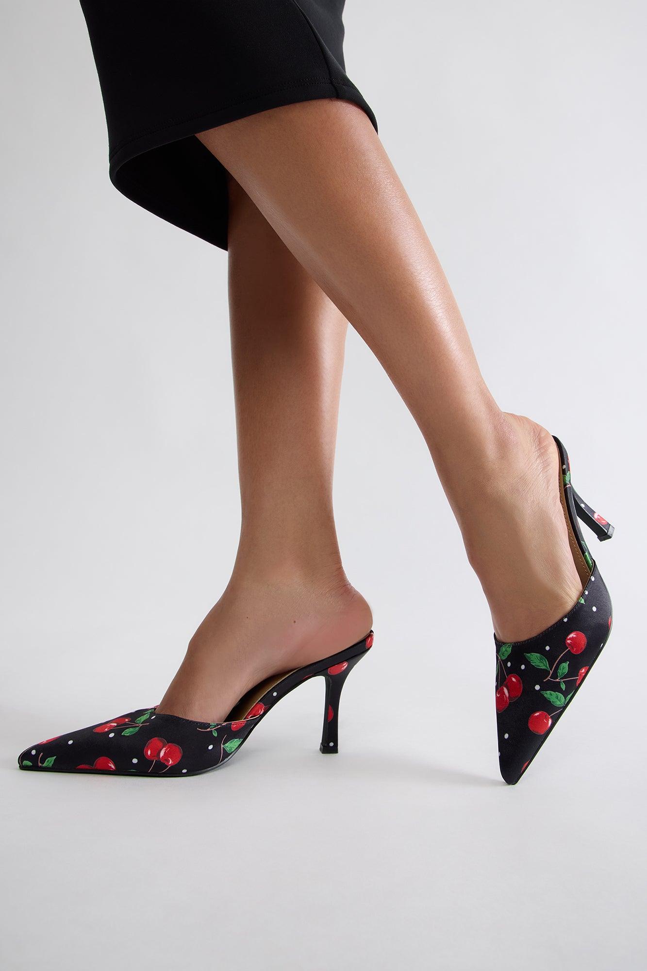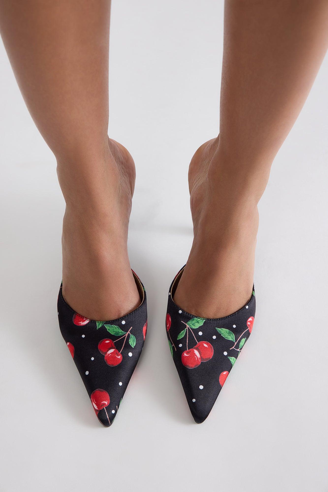 Available In Black And Pink. Pumps Cherry Print Pointed Toe 3" High Heel Imported California Proposition 65 WARNING: Cancer and Reproductive Harm - www.P65Warnings.ca.gov.
