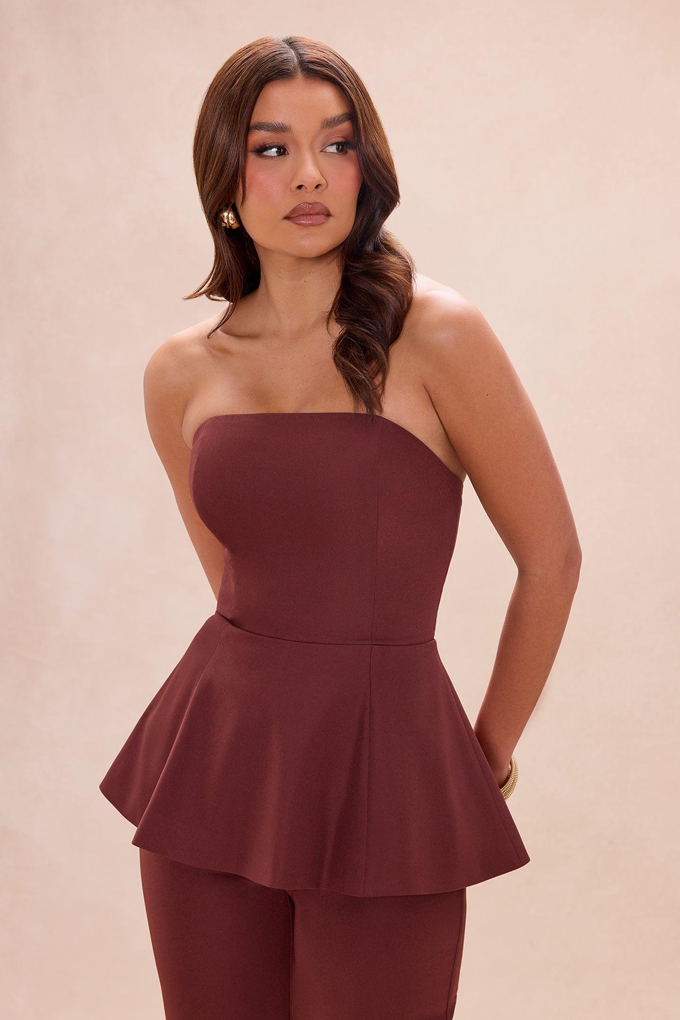 Available In Chocolate. Pant Ensemble Peplum Top Strapless, Straight Neckline Grip Tape, Boning Hidden Back Zipper Closure Lined Non Stretch Flare Pant Belt Loops Pockets Faux Back Pockets, Split Hem Shell: 92% Polyester 8% Spandex Lining: 100% Polyester Imported California Proposition 65WARNING: Cancer and Reproductive Harm - www.P65Warnings.ca.gov.