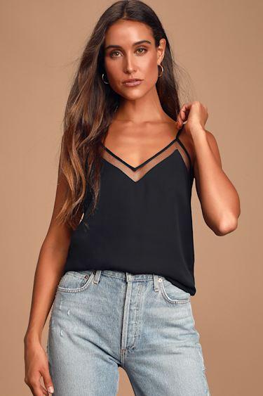 The Lulus Sweet Fling Black Mesh Tank Top is always a delectable choice! Adjustable spaghetti straps support a woven triangle bodice with sheer mesh at the neckline.