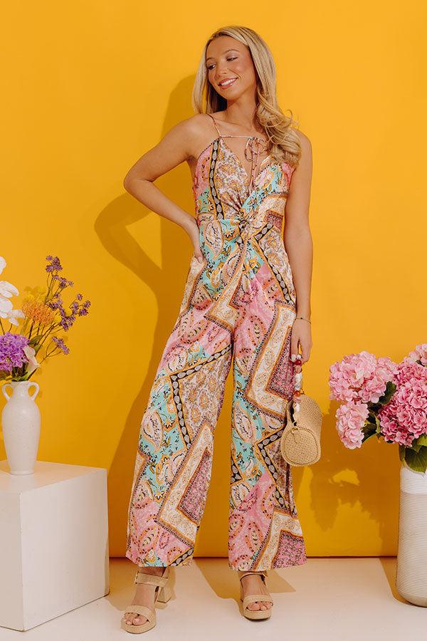 – Jump into style effortlessly in this stunning piece – Unlined lightweight material – Patterned with an abstract paisley print – V-cut neckline with a front tie accent – Adjustable spaghetti straps with a straight smocked back – Relaxed pants silhouette that ends in straight hemlines Measurements S : Bust 30", Hip 32", Inseam 27.5", Length 51", Waist 24-26". M : Bust 32", Hip 34", Inseam 27.5", Length 51", Waist 26-28". L : Bust 34", Hip 36", Inseam 28", Length 51.5", Waist 28-30".