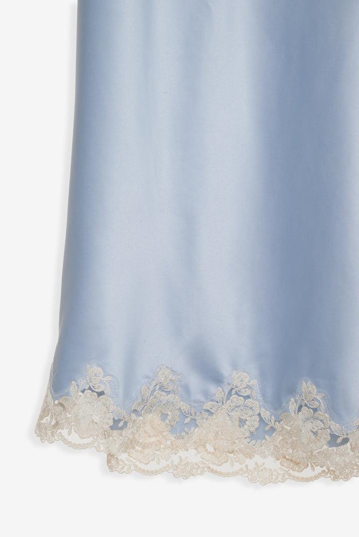 Designed for the ultra-romantic and vintage-loving Muse—the Sweetheart blue midi skirt exudes femininity, spotlighting a dainty scallop lace, picot trim, and a satin bow at the center-front. Crafted in a sleek bias-cut satin, this slip skirt skims the body through the hips and flares out through the hem.