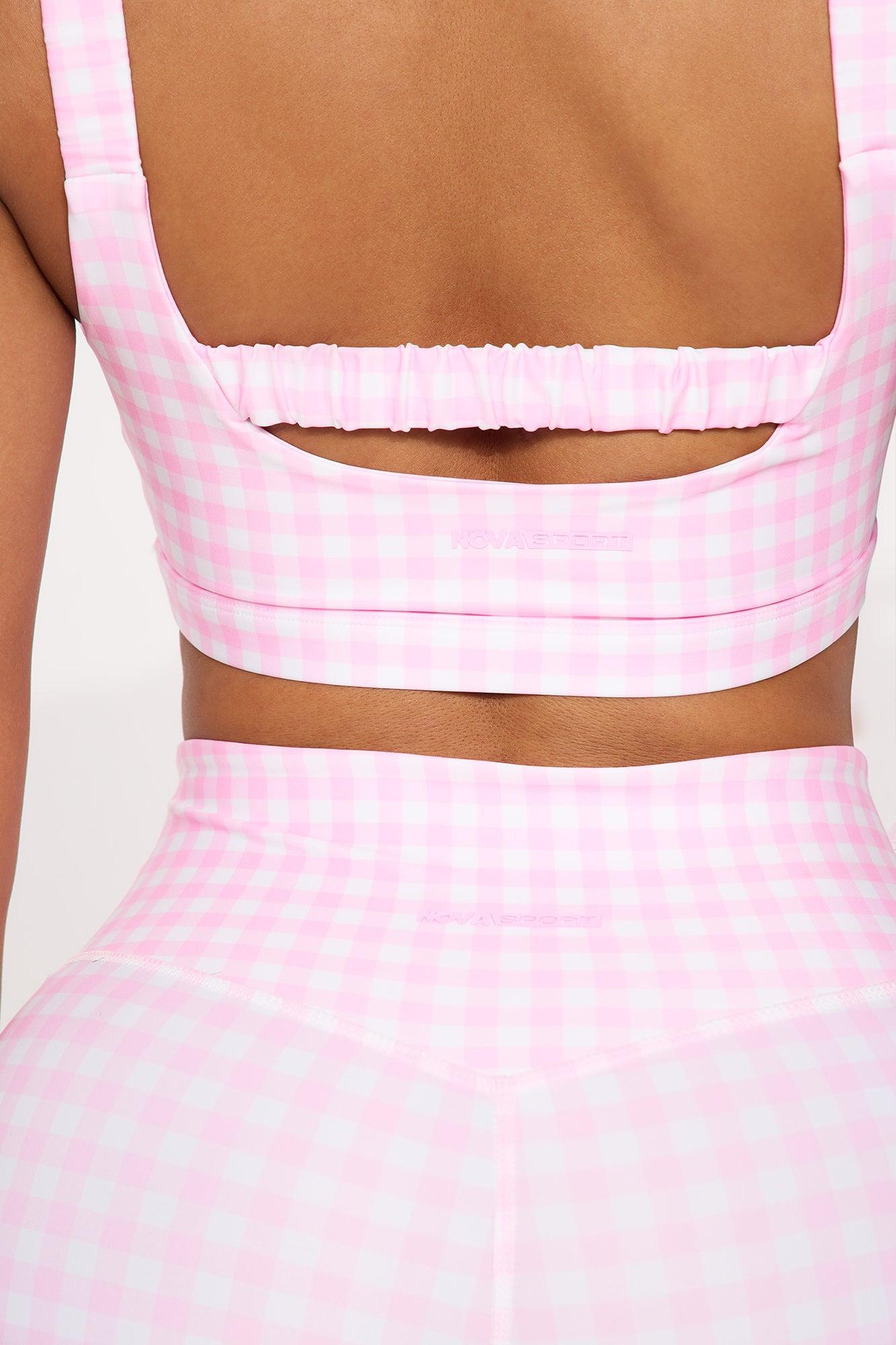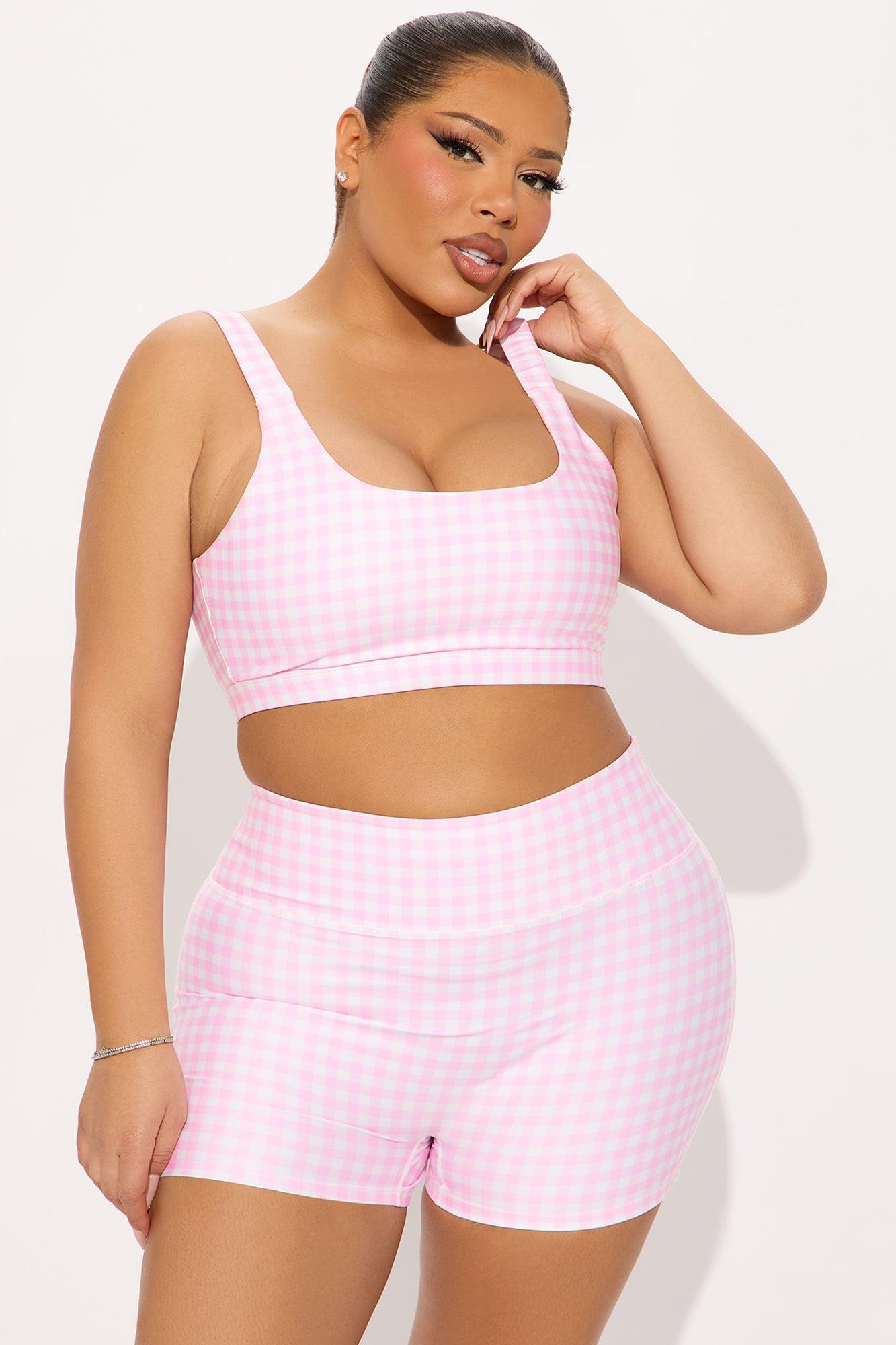 Available In Blush And Butter Yellow. Active Set Sports Bra Scoop Neck, Sleeveless Cut Out Detail Active Short, High Waisted Elastic Waistband 3" Inseam Elevate Gingham Print High Impact, Stretch Disclaimer: Print Placement Will Vary. Shell: 73% Polyester 27% Spandex Mesh: 82% Nylon 18% Spandex Imported