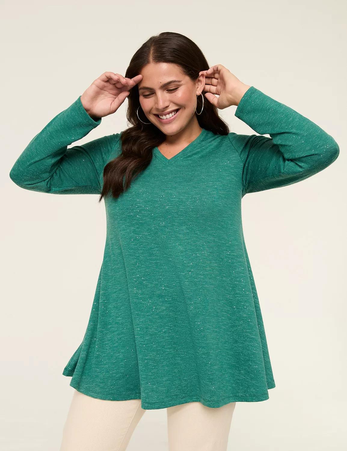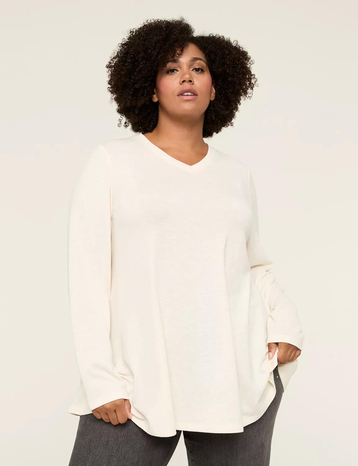 Available in Plus Size We have the best made-for-curves tees out there. Why? Our Swing fit has the perfect fit-to-flatter flow, while our so-soft knit feels (& looks) so good on. Then, we finish with season-perfect details, like the light-catching sparkle of this tee. FIT: SWING. Our just-right full swing perfectly flatters your curves. Front Body Length From Shoulder: 33 (On Size 18) Tunic length is perfect for added coverage FEATURES: V-neck Long sleeves SPECIAL DETAIL: Sparkly detailing FABR