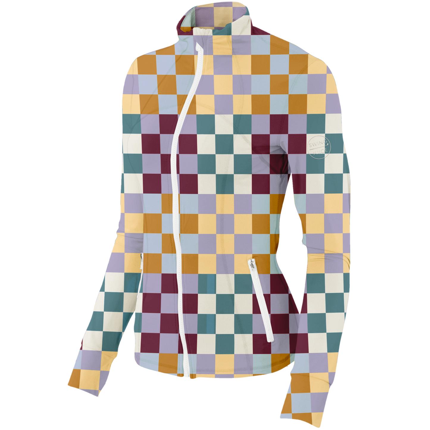 Brighten up your golf attire with the Golf Multi Checker Women's Full Zip jacket. This long sleeve full zip jacket features a colorful checkerboard pattern, crafted from breathable, quick-dry EcoTec micro polyester, and tailored for a feminine fit.