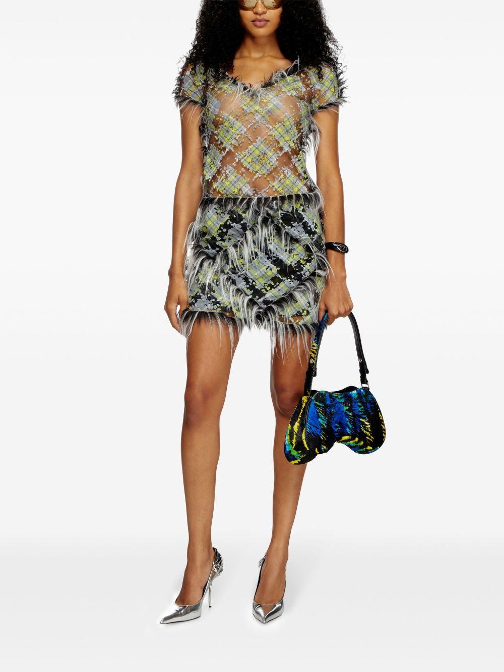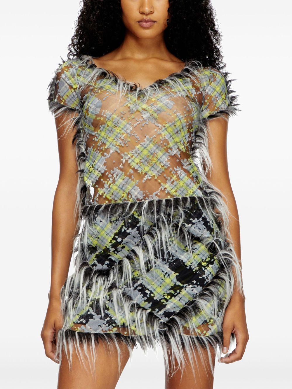 Diesel T-uffy cropped top | Black | black/multicolour | tulle netting | devoré effect | check pattern | semi-sheer construction | cropped | concealed side zip fastening | V-neck | cap sleeves | frayed edge | Polyamide | Blouses | Tops | Clothing | Women