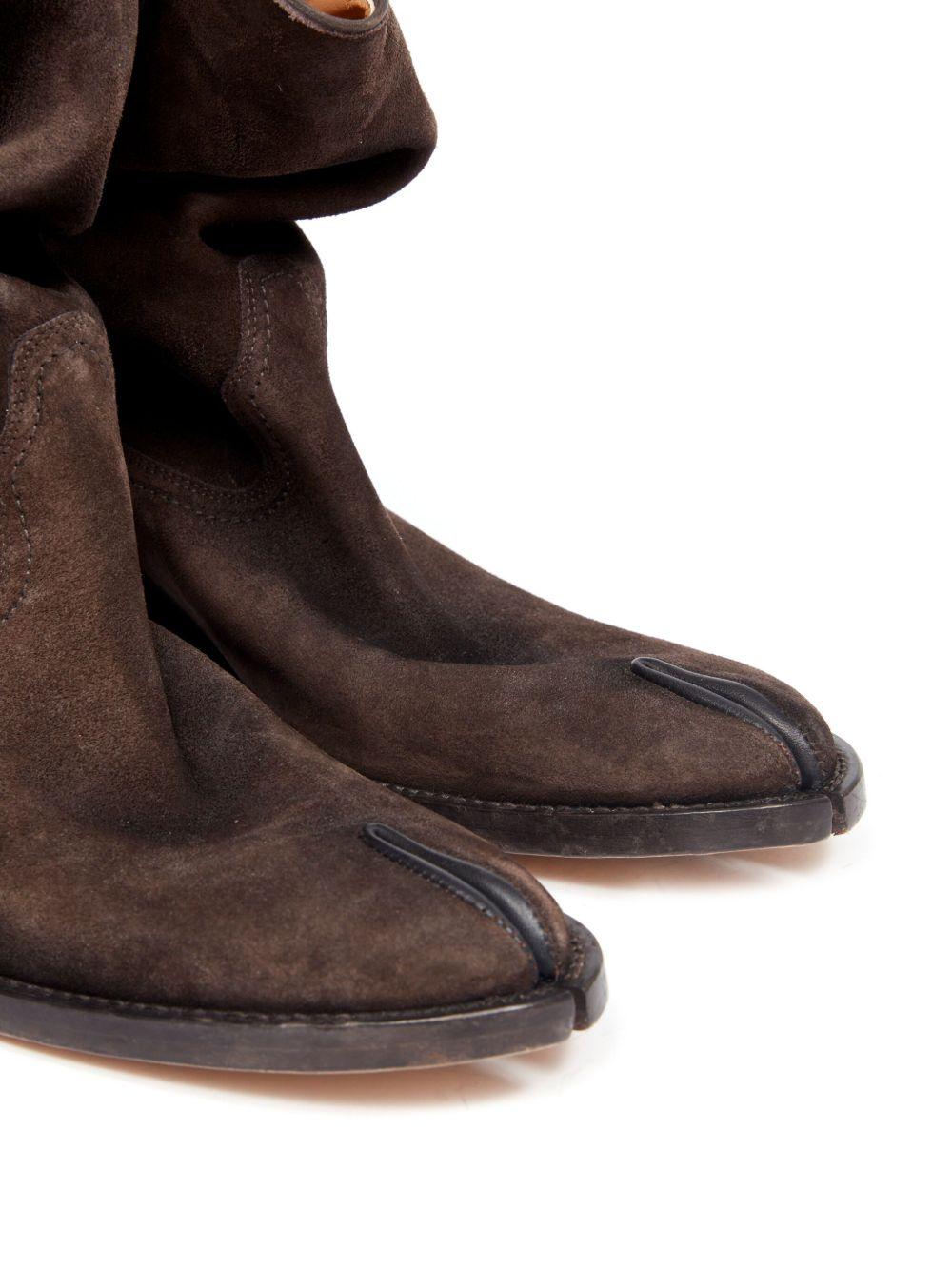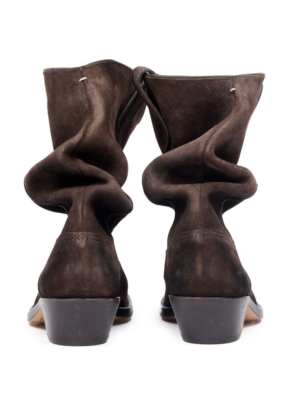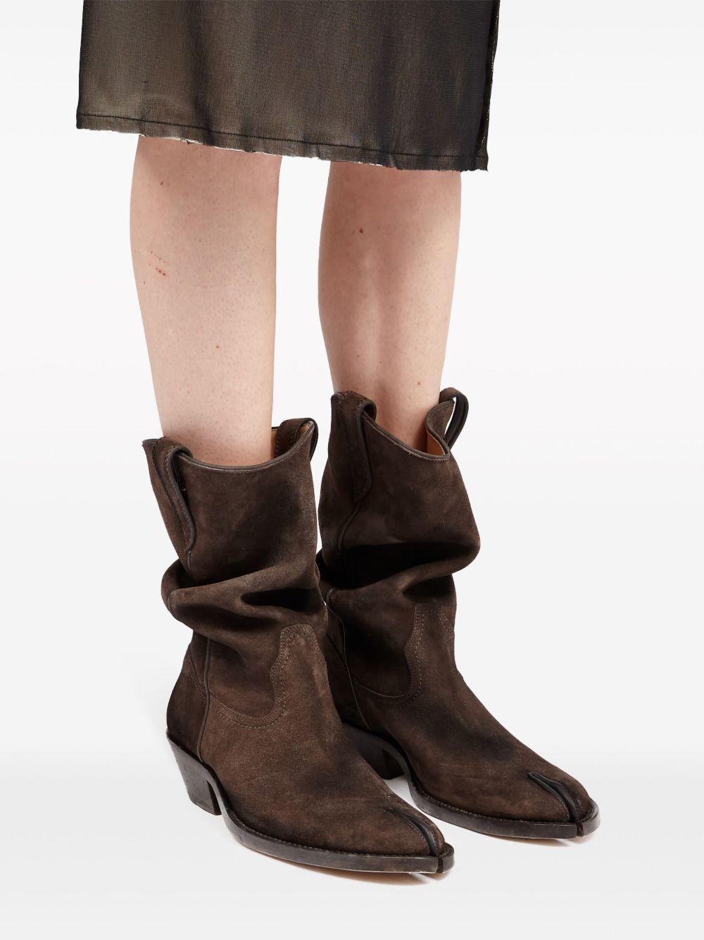 Maison Margiela Tabi 55mm slouchy Western boots | Brown | cedar brown | calf suede | Western-style panelling | signature single-stitch logo | signature Tabi toe | double pull-tab at the opening | branded leather insole | 55mm Cuban heel | leather sole | ankle-length | Calf Leather/Calf Suede/Lambskin/Rubber/Calf Leather | Cowboy Boots | Boots | Shoes | Women