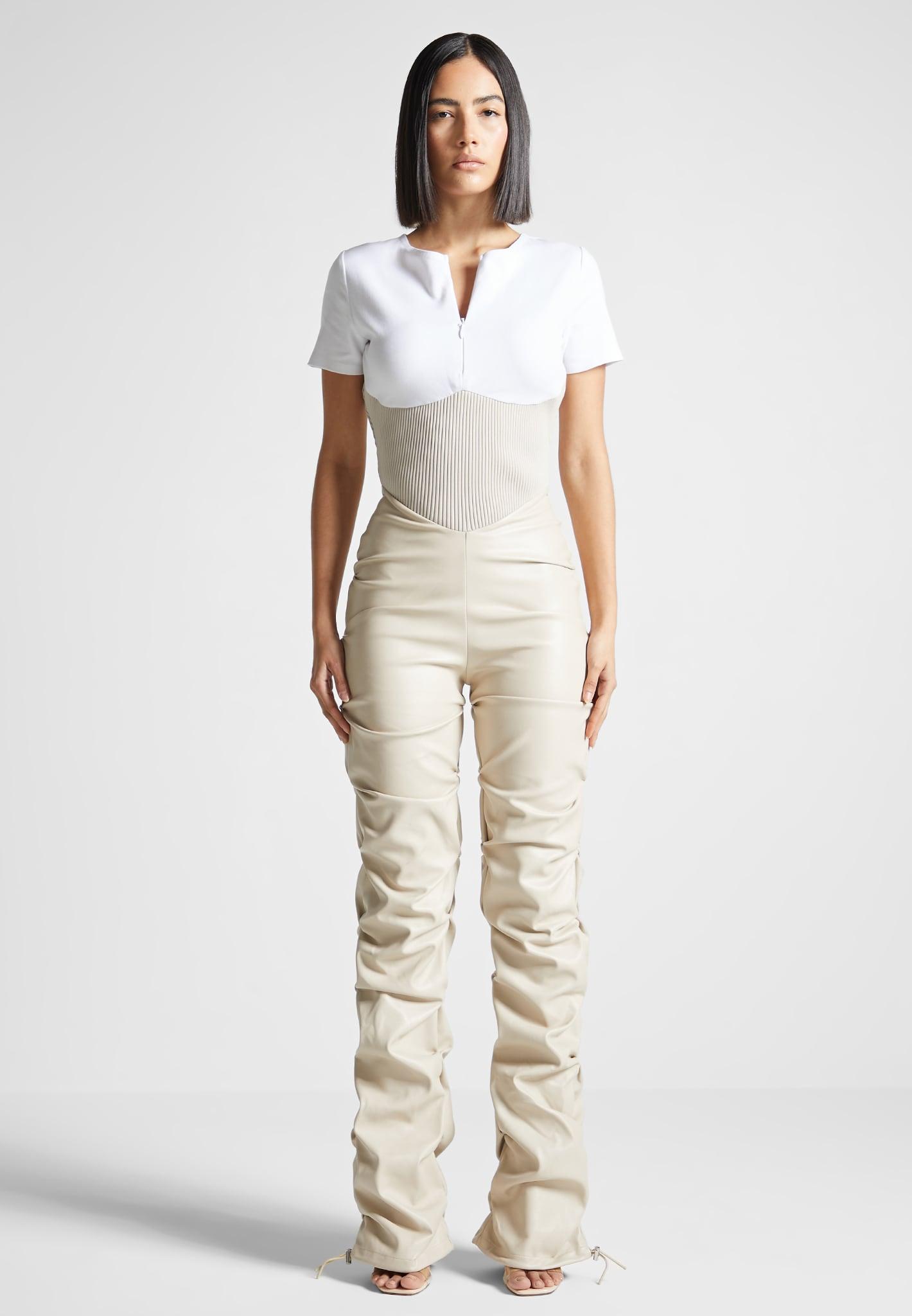Our Tacked Vegan Leather T-Shirt Jumpsuit features a flattering fit and cinched waist creating a stunning ensemble that effortlessly combines fashion-forward design. Crafted from high-quality vegan leather, this jumpsuit maintains a luxurious and edgy appeal. Jumpsuit Silhouette Tacked Vegan Leather Trouser Feature Concealed Zip at Chest Back Zip Closure Ribbed Cinch Waist Design Silver Manière De Voir Eiffel Zip 55% Polyester, 45% PU / 90% Polyester, 10% Elastane / 95% Cotton 5% ElastaneAlways check the care label for wash instructions.