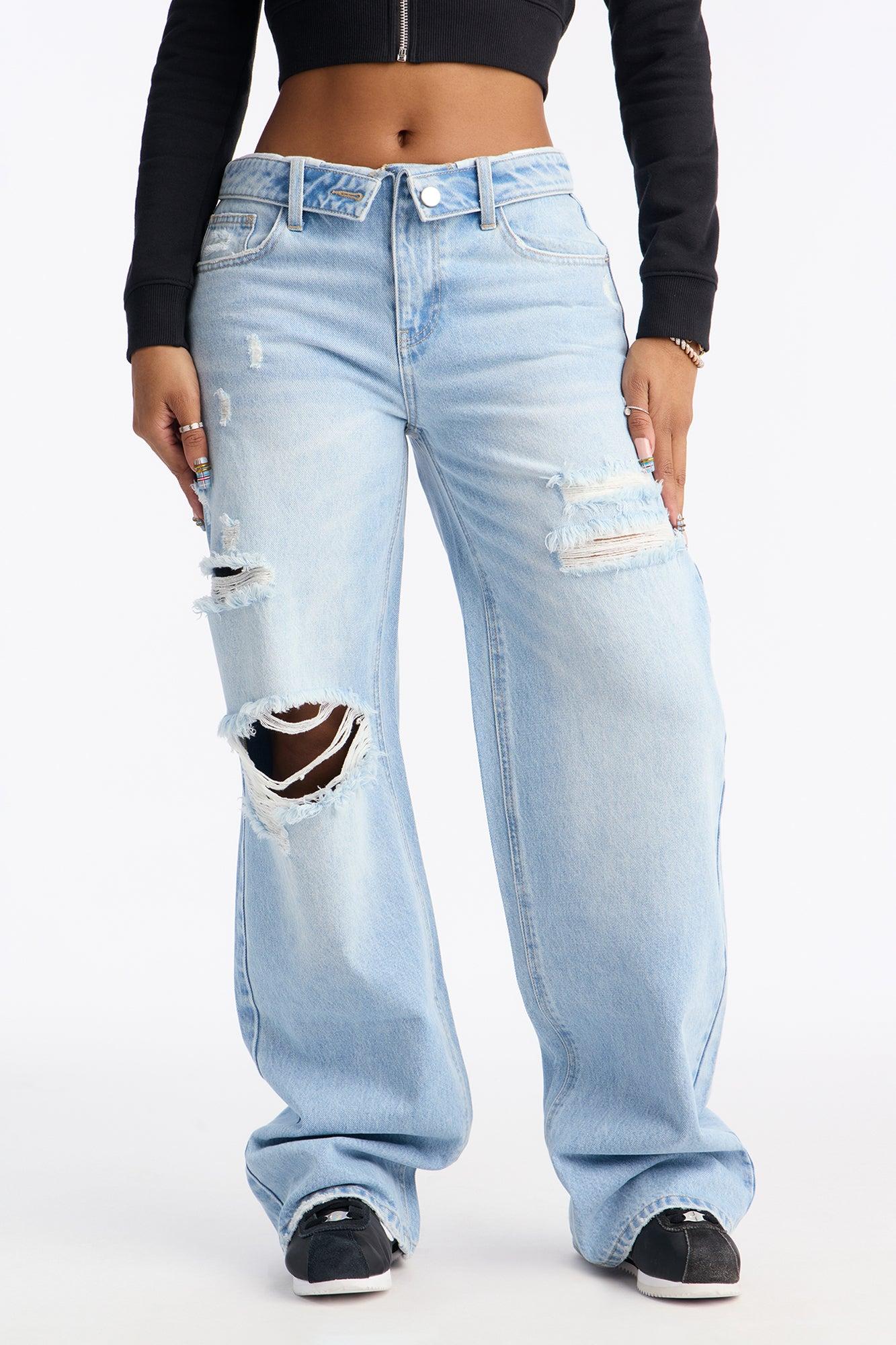 Available In Light Wash. Wide Leg Jean 5 Pocket Fold Over Waistband Ripped 10" Rise 32.5" Inseam Non-Stretch Disclaimer: Due To The Specialized Wash, Each Garment Is Unique. 100% Cotton Imported