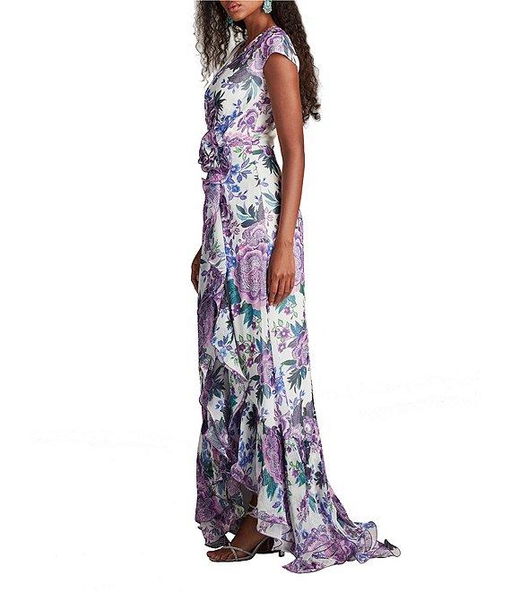 Tadashi Shoji Chiffon Floral Print V Neck Cap Sleeve Ruffle Fit and Flare Gown