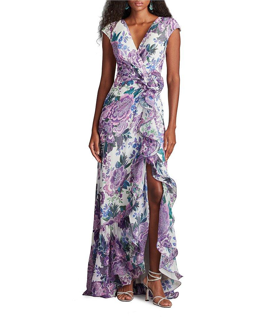 From Tadashi Shoji, this dress features: Chiffon fabrication Floral print Fit and flare silhouette V-neckline Cap sleeves Ruffle detail Front slit detail Lined Back zipper closure Approx. 63.25" length Polyester Dry clean Imported.