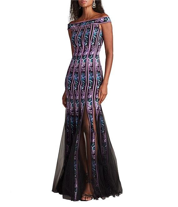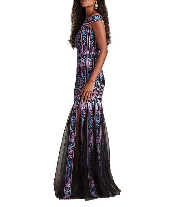From Tadashi Shoji, this gown features: Mermaid silhouetteChiffon fabricationFloral motifRibbon seamingOff the shoulder necklineCap sleevesIllusion godets at hemZip back closureLinedApproximate length 63.25"PolyesterDry cleanImported.