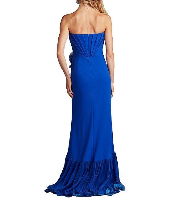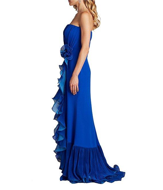 Tadashi Shoji Strapless Pleated Bodice Cascading Ruffle Crepe Sheath Gown