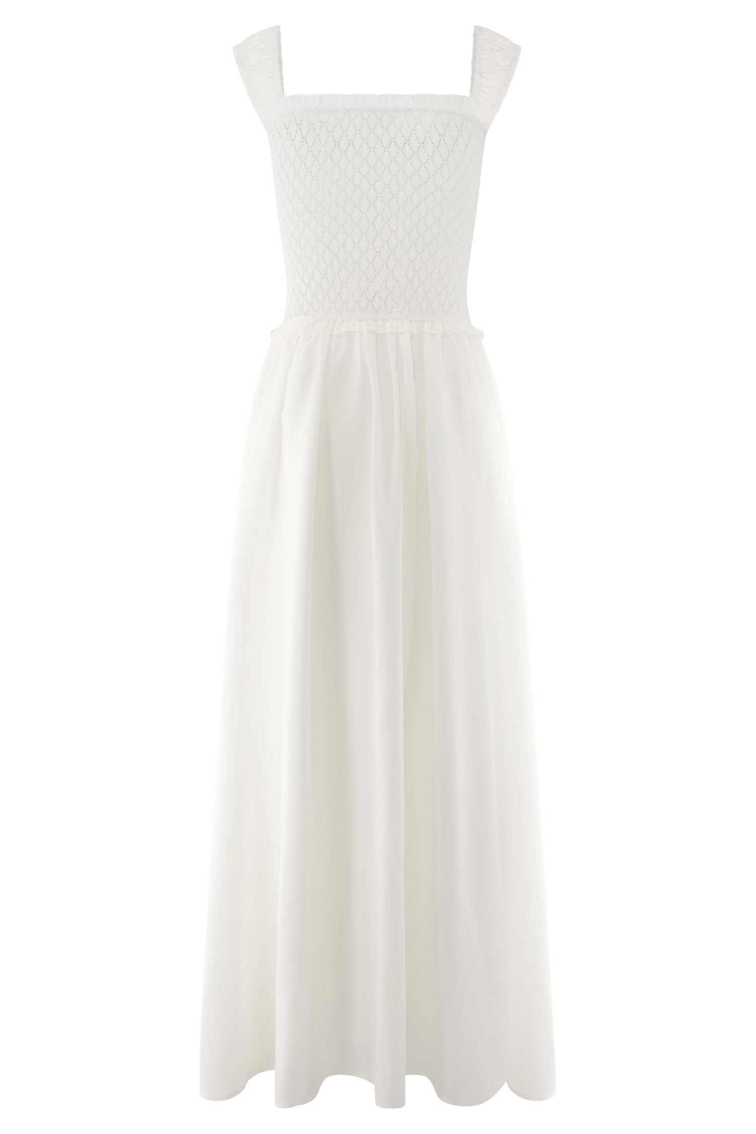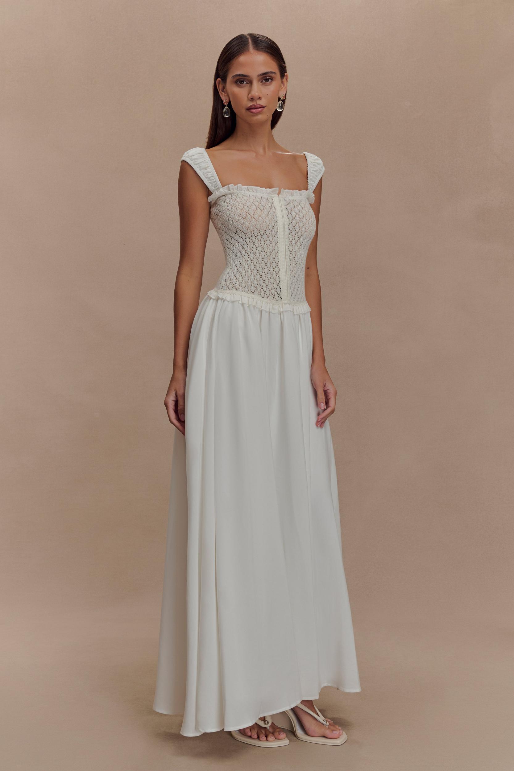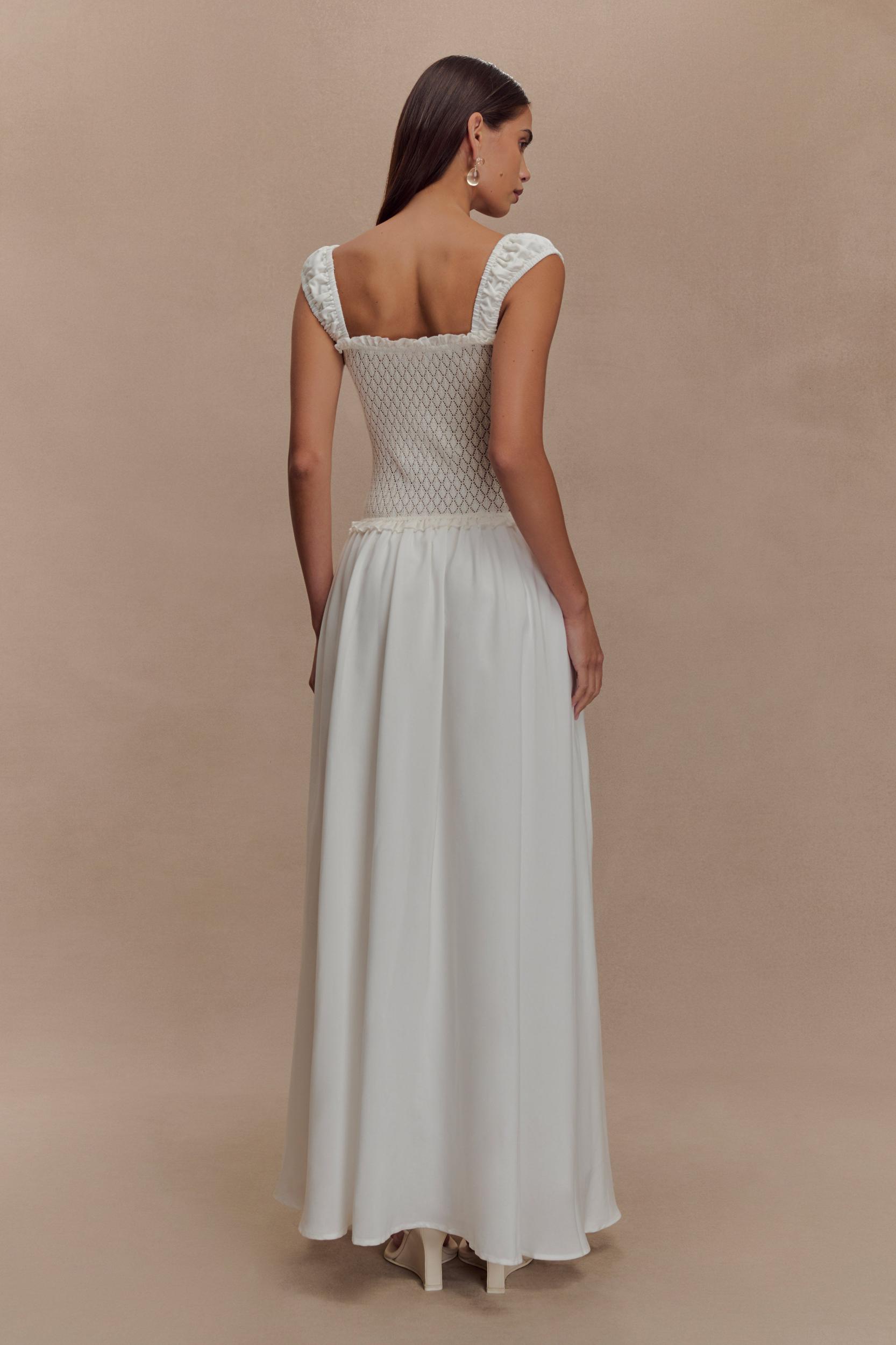 For endless summers. The TAHLIA Pointelle Knit Midi Dress is a delicate fusion of texture and romance. Designed with a flattering square neckline, this midi dress features elasticated cap sleeves and frill detailing along the neckline and waist seam for a soft, feminine touch. The knit bodice hugs the figure, while the low-waist A-line silhouette flows into a woven gathered skirt, creating graceful movement. A front hook-and-eye closure adds vintage charm, while the partially lined design ensures breathability and comfort. Perfect for sunlit days, special occasions, or effortless everyday elegance.