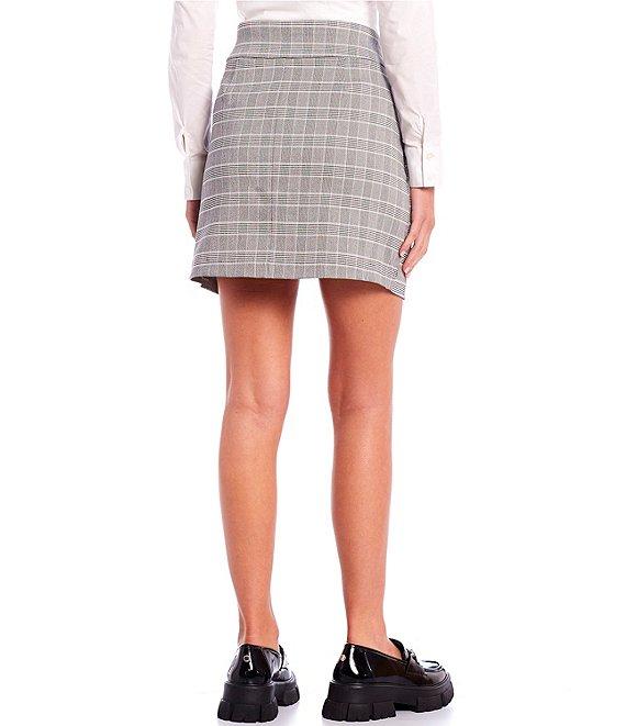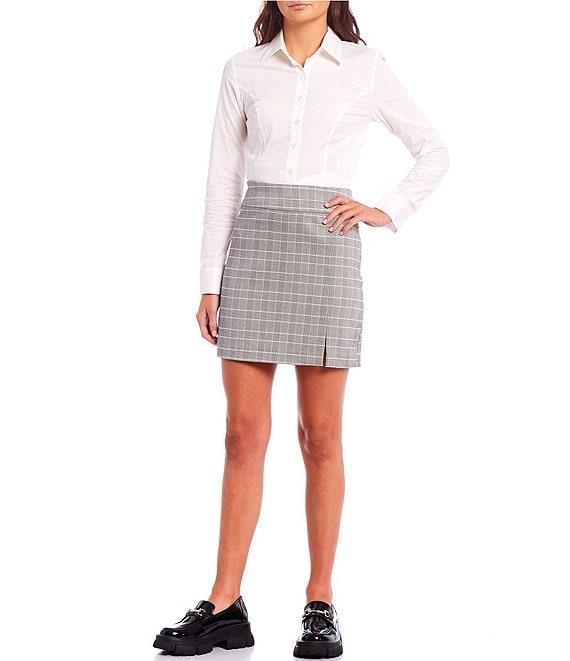 From Takara, this skirt features: Mid rise Plaid print Slit front Back zipper closure Polyester/rayon/spandex Machine washable Imported.