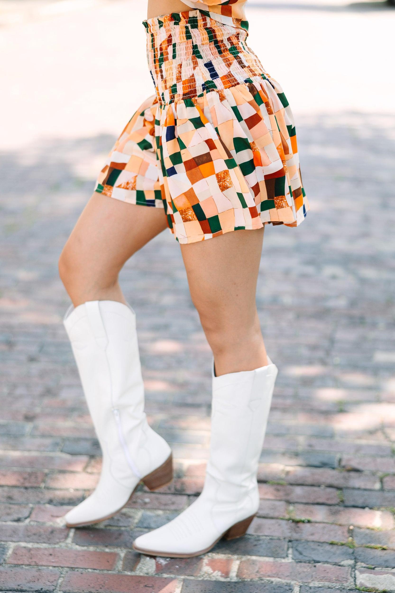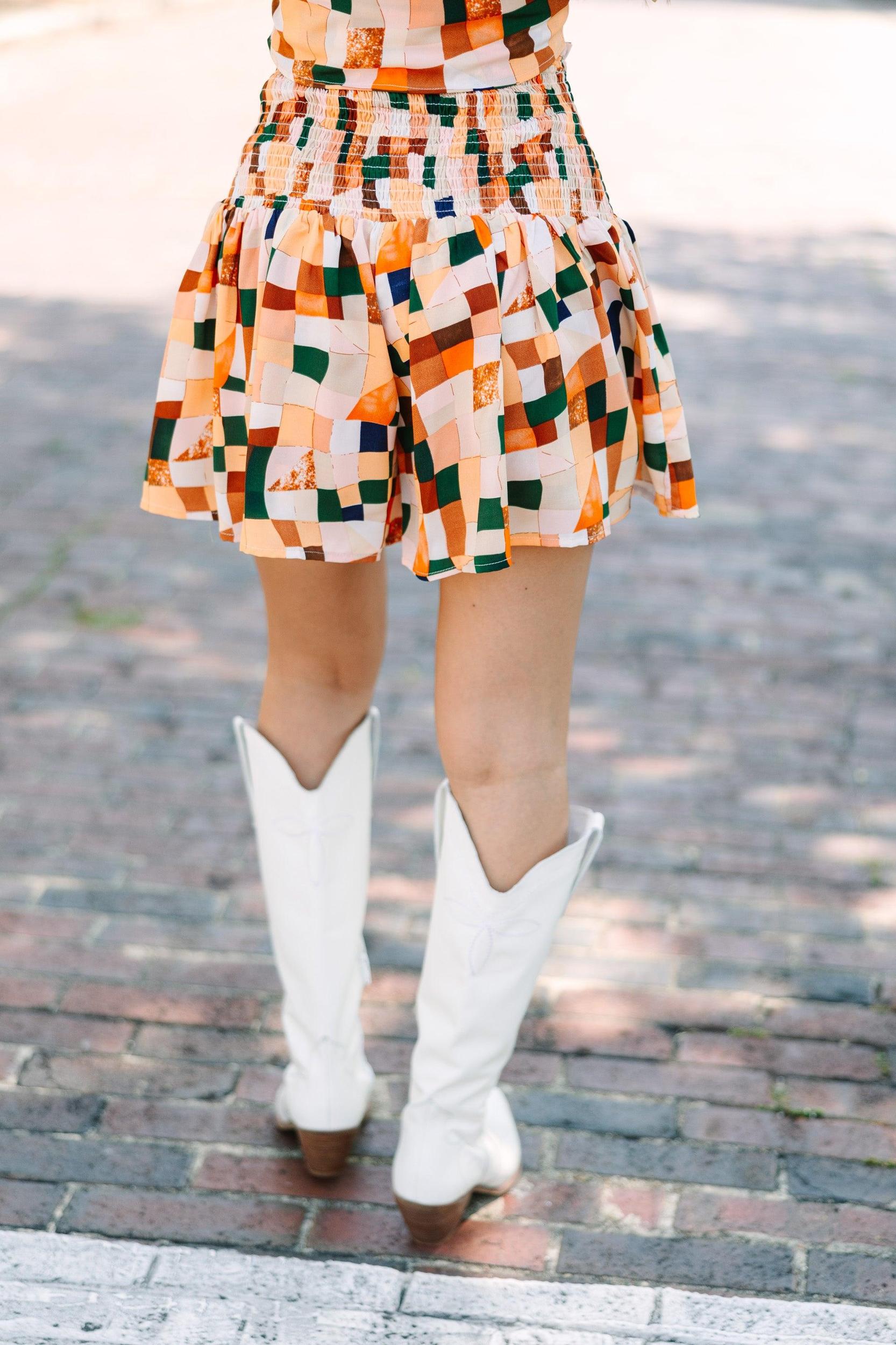 Take a look at these shorts! They're so fun! We love that geometric abstract print and those hues couldn't be more perfect for the season! These casual cute short are going to look great with basic sees, solid blouses, or you can pair them with the matching top we have available! Smocked waist Abstract geometric print No stretch however the smocking extends the waist Cindy is wearing the small.