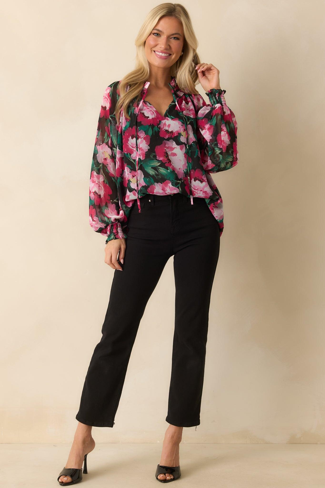 The Take It All In Pink Multi Floral Print Chiffon Peasant Top is a breath of fresh air, featuring a vivid floral print that instantly lifts the mood with details that give it a graceful, bohemian touch - perfect for days that call for a little extra color and charm. This pink multi floral top features a lightweight chiffon fabric with a vibrant painterly print, a split neckline with tie detail, long sheer sleeves with smocked cuffs, and a relaxed, flowy silhouette for an effortlessly feminine look. 97% Polyester & 3% Lurex Lined: 100% Polyester Hand Wash Cold Manufactured in China Designed in The USA Model is 5'8" and is Wearing a Size Small