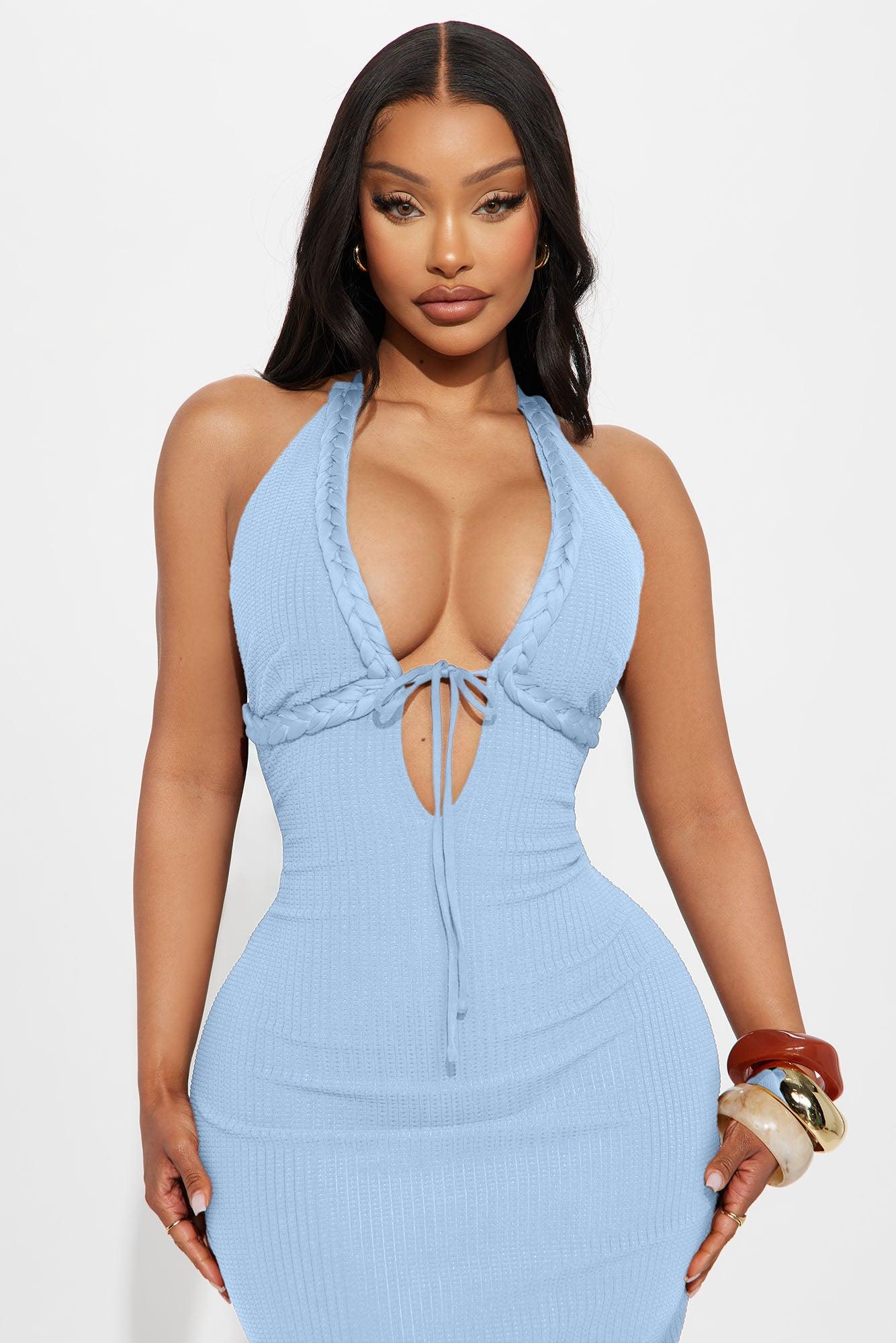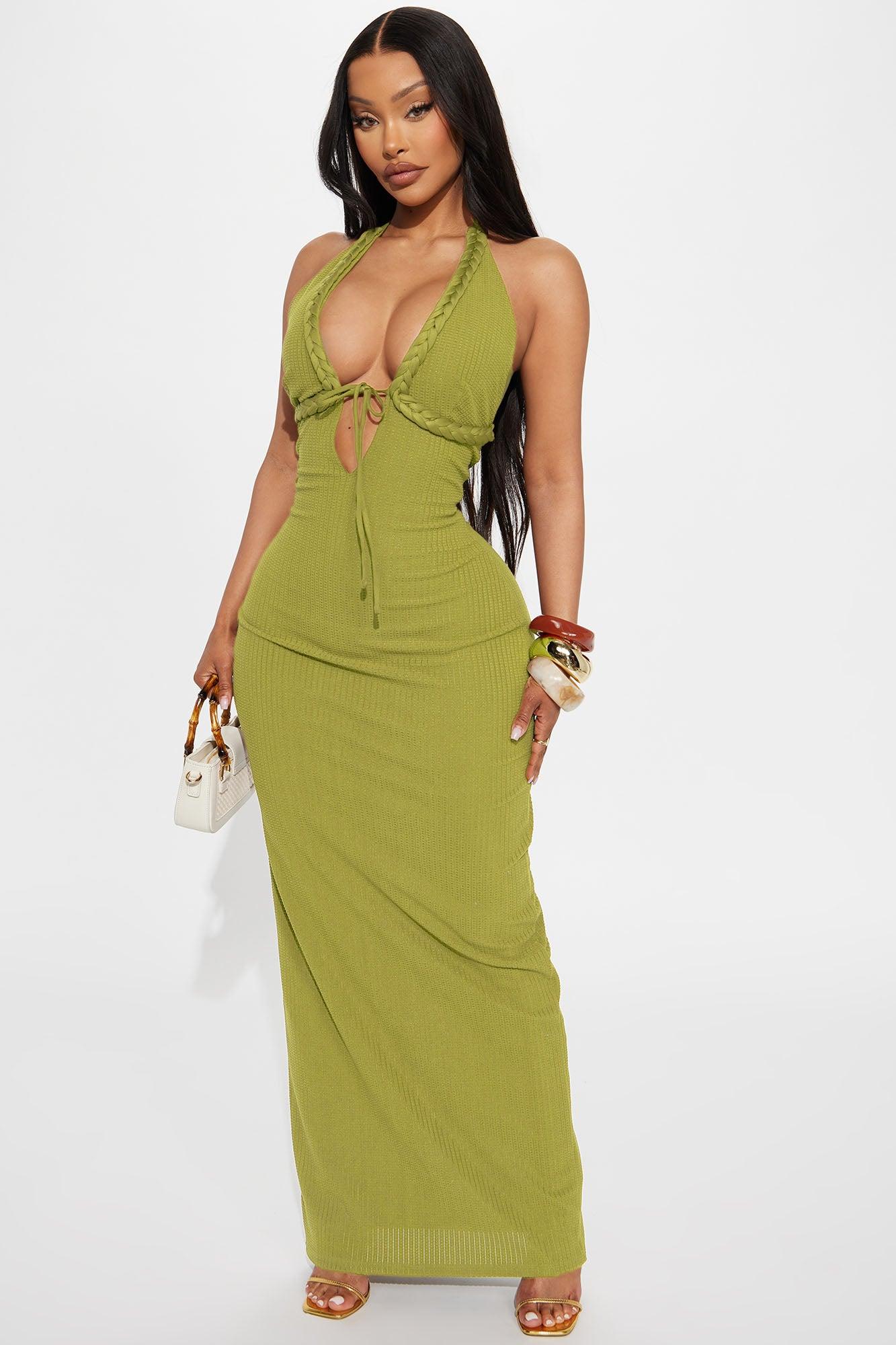 Available In Chartreuse, Chocolate And Cream. Maxi Dress Tie Halter Deep V Neck Braided Trim Tie Front Backless Lined Stretch Self: 95% Polyester 5% Spandex Contrast: 95% Polyester 5% Spandex Lining: 100% Polyester Imported
