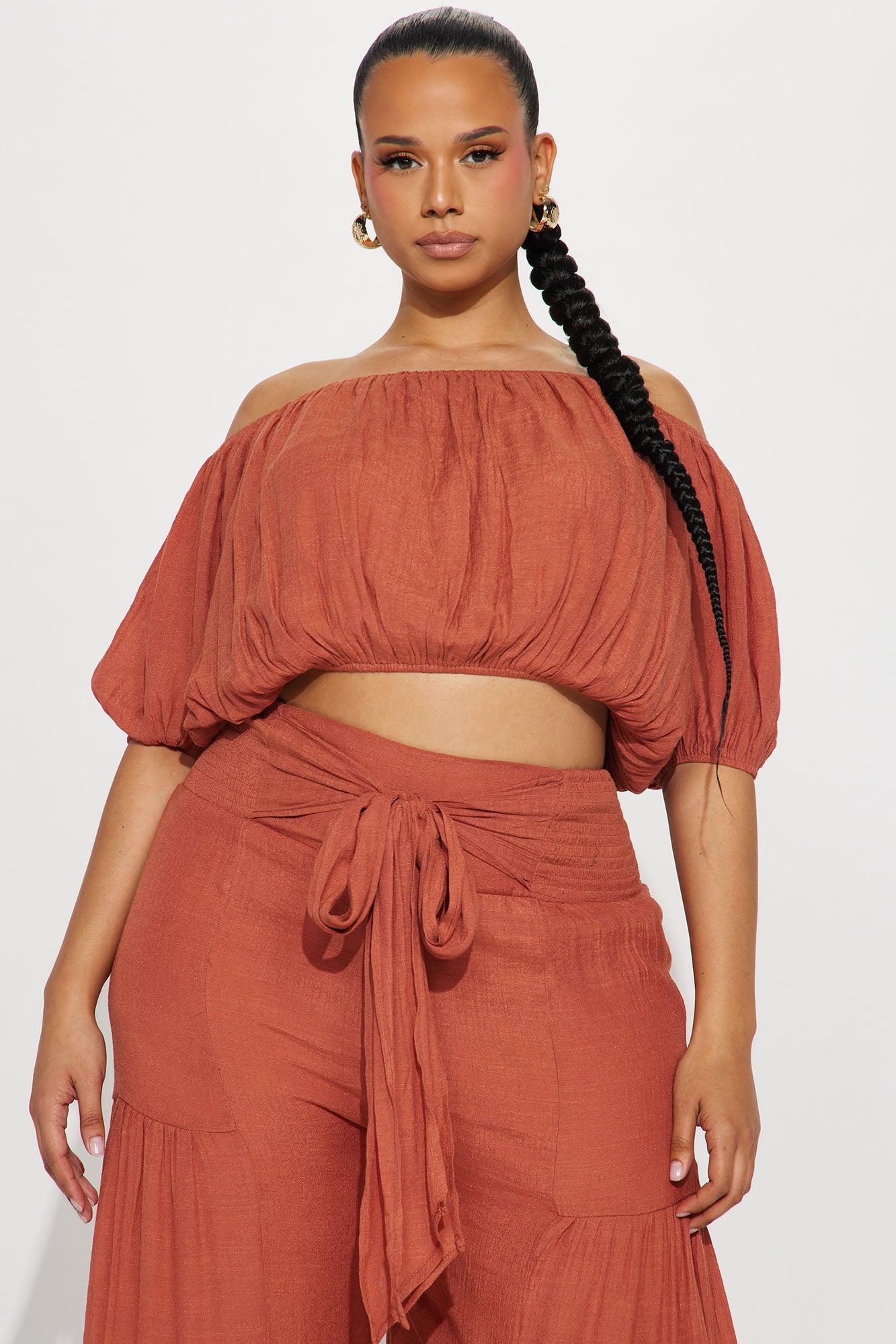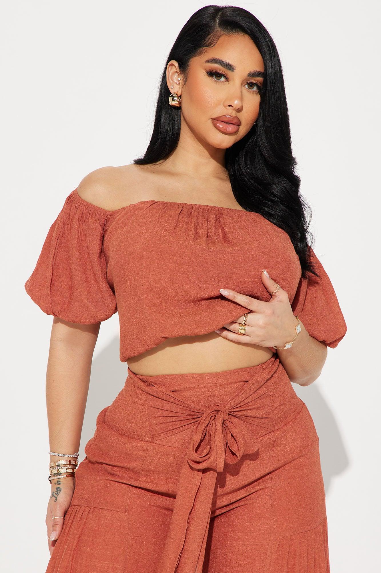 Available In Black And Rust. Pant Set Off Shoulder Top Short Sleeve Cropped Wide Leg Pant Tie Waist Smocked Waist Self/ Lining: 100% Polyester Imported