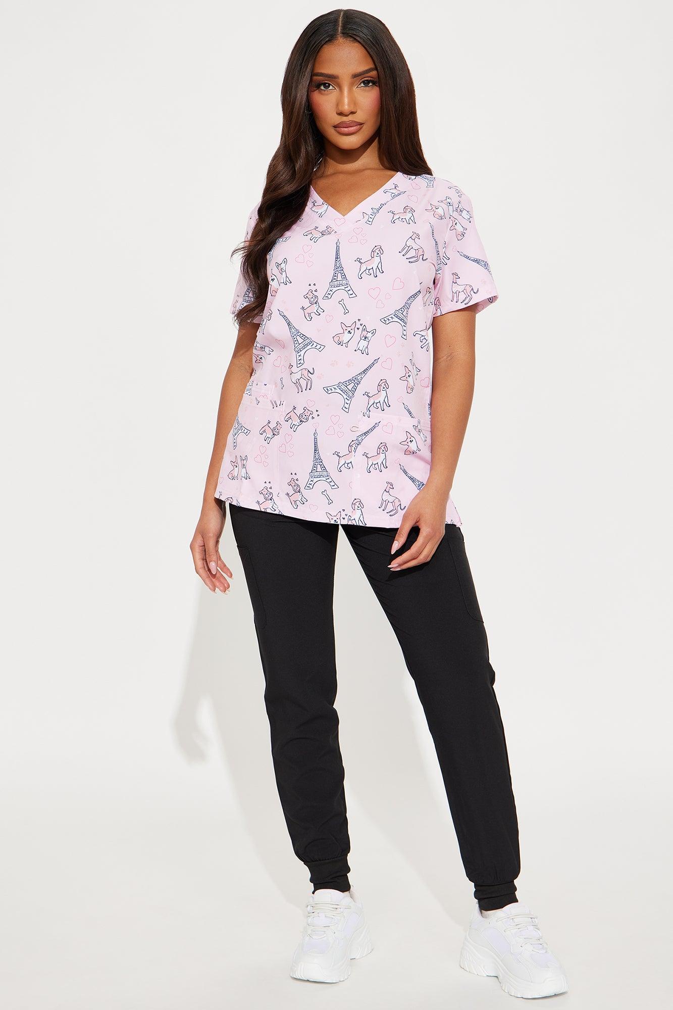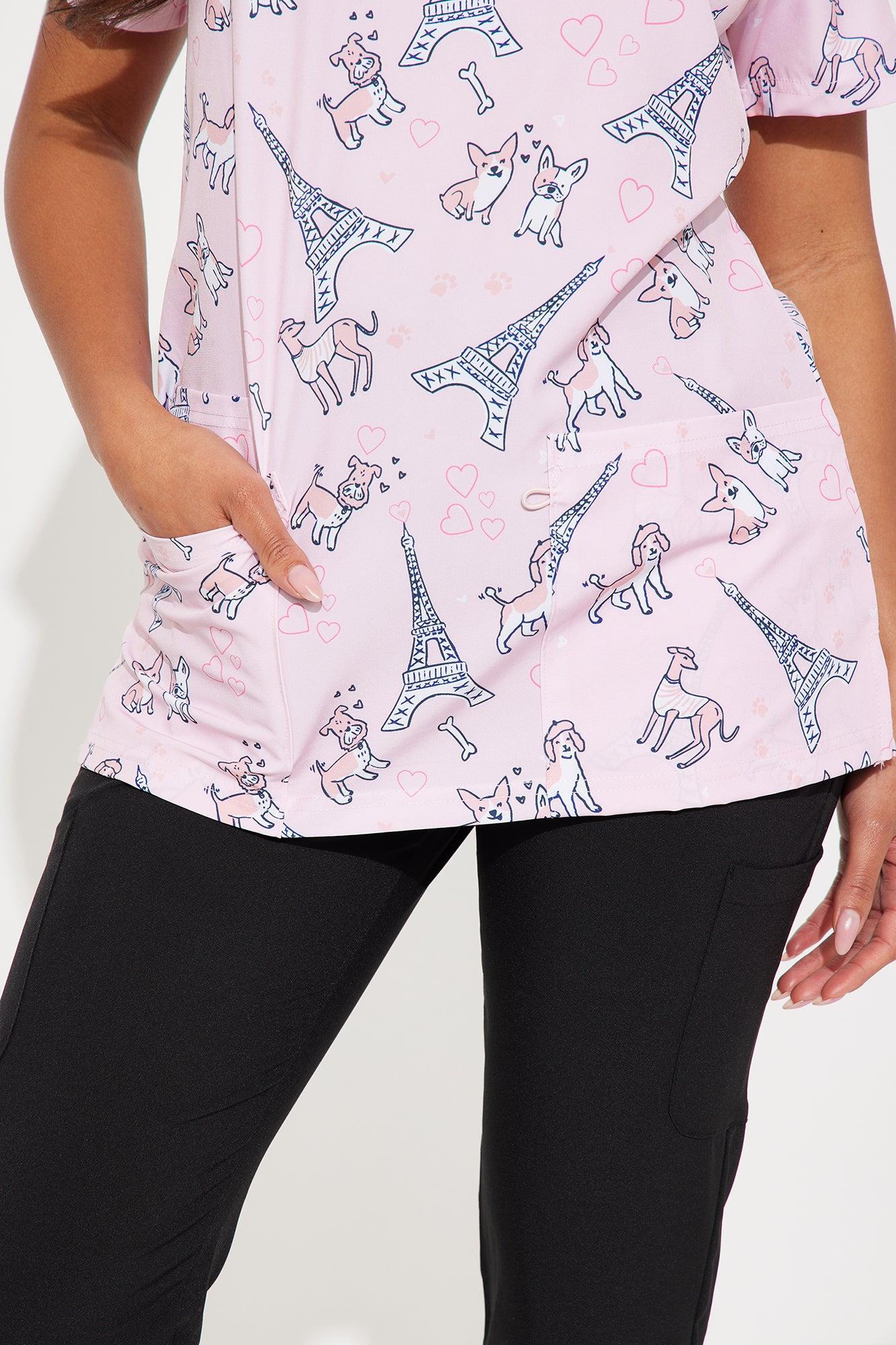 Available In Pink. Uniform Scrub Top V Neck Short Sleeve Pockets Paris Print Stretch Disclaimer: Print Placement Will Vary 93% Polyester 7% Spandex Imported California Proposition 65WARNING: Cancer and Reproductive Harm - www.P65Warnings.ca.gov.