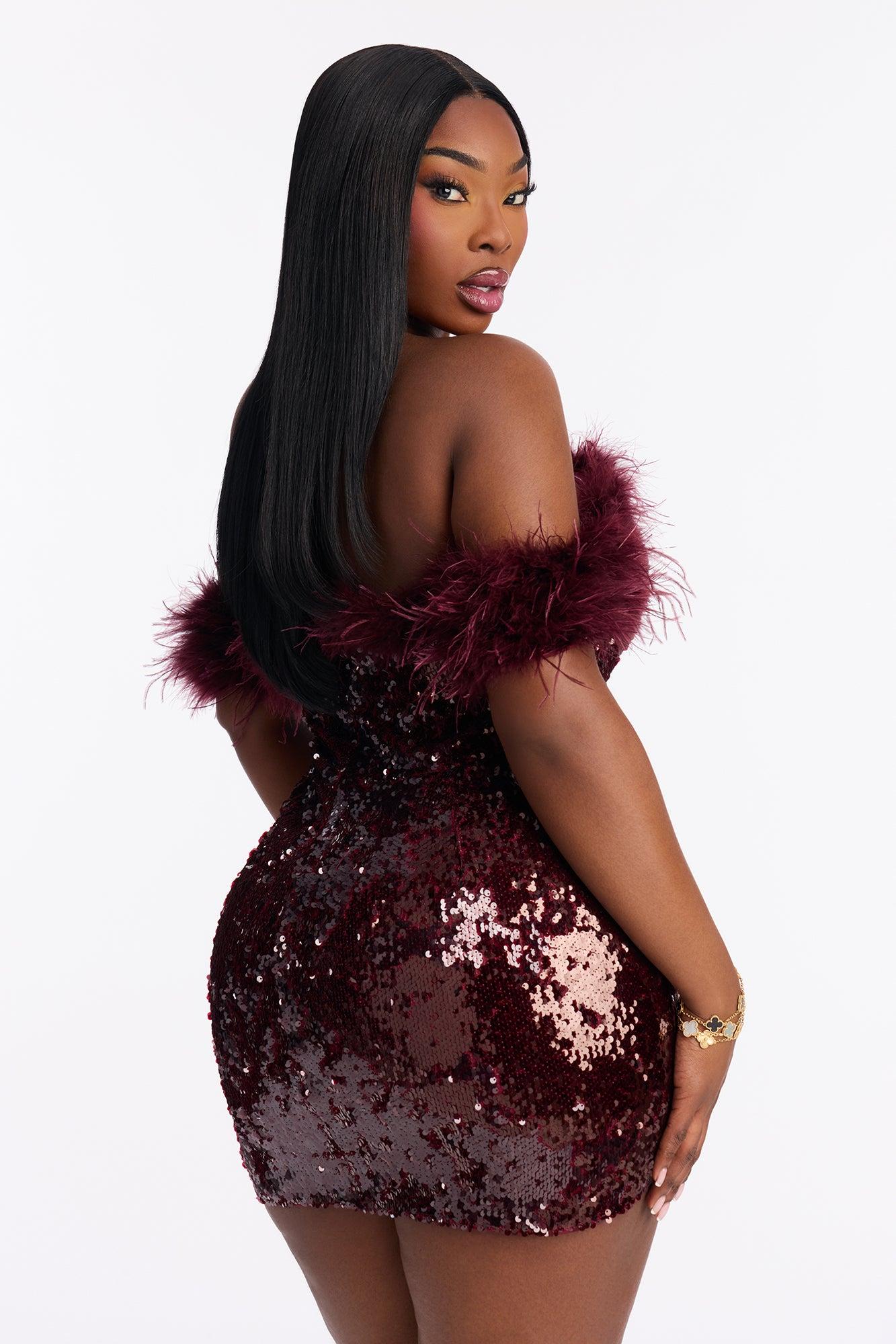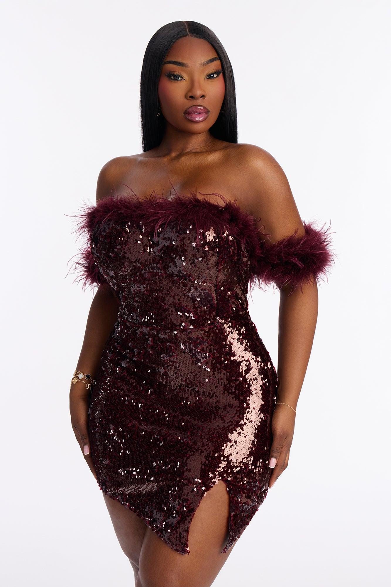 Available In Burgundy. Sequin Mini Dress Off Shoulder Short Sleeve Feather Trim Padded Bra Cup Asymmetrical Hem Slit Open Back Zipper Stretch Length Measured Flat = 24" Self: 95% Polyester 5% Spandex Lining: 100% Polyester Imported California Proposition 65WARNING: Cancer and Reproductive Harm - www.P65Warnings.ca.gov.
