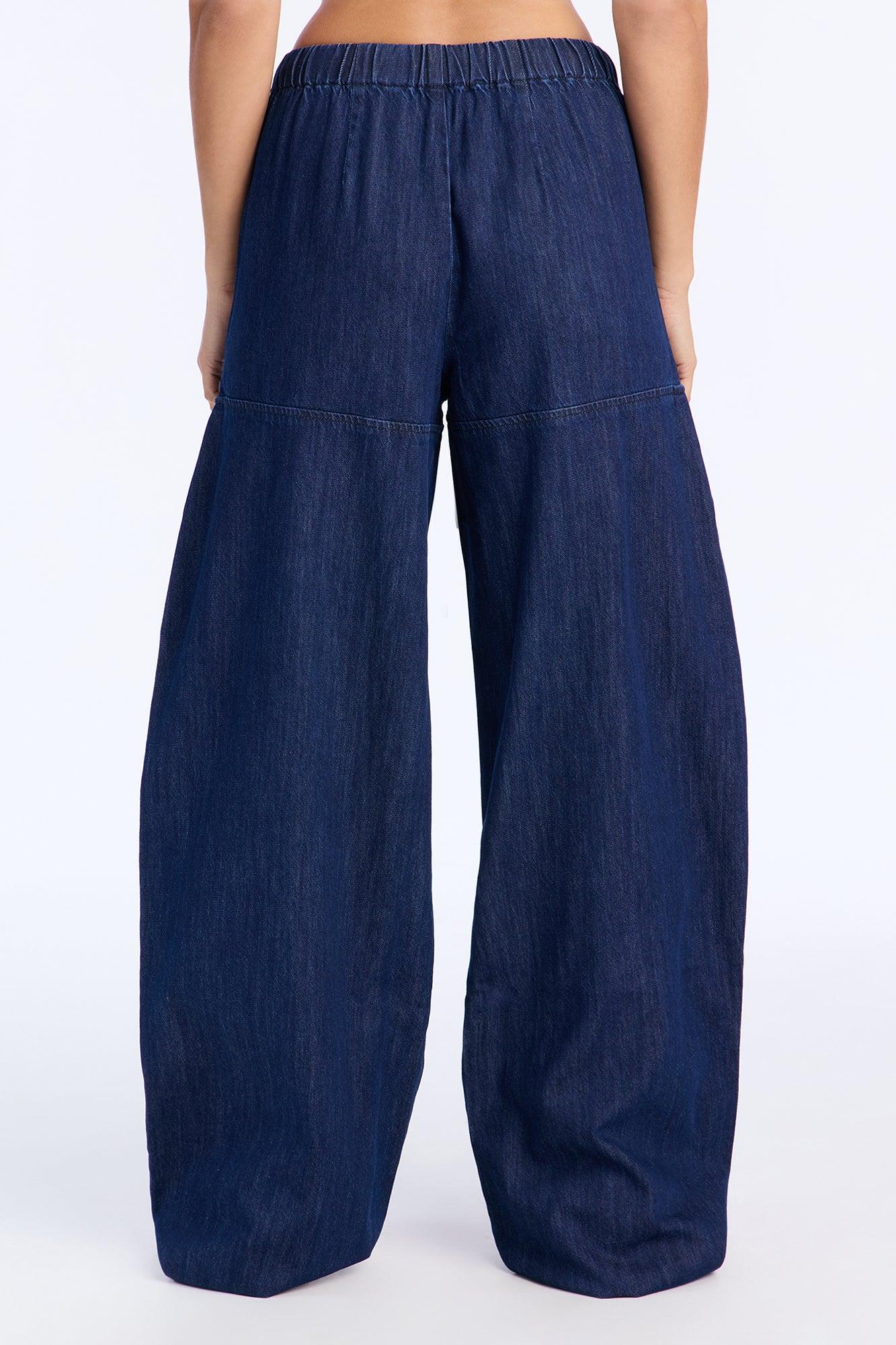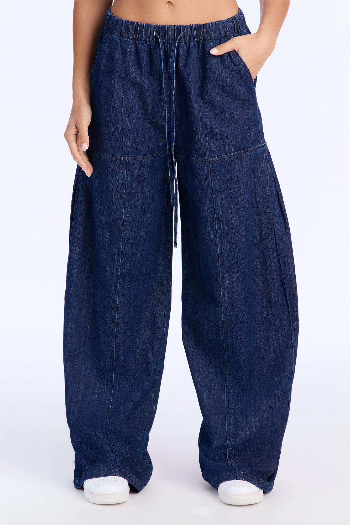 Available In Dark Wash. Available In Petite 31" Inseam, Regular 34" Inseam & Tall 37" Inseam Wide Leg Pull On Jean Trouser Pocket Tie Waist Elasticized Waistband For Comfort 11.5" Rise 37" Inseam Non-Stretch Self: 98% Cotton 2% Other Fibers Imported
