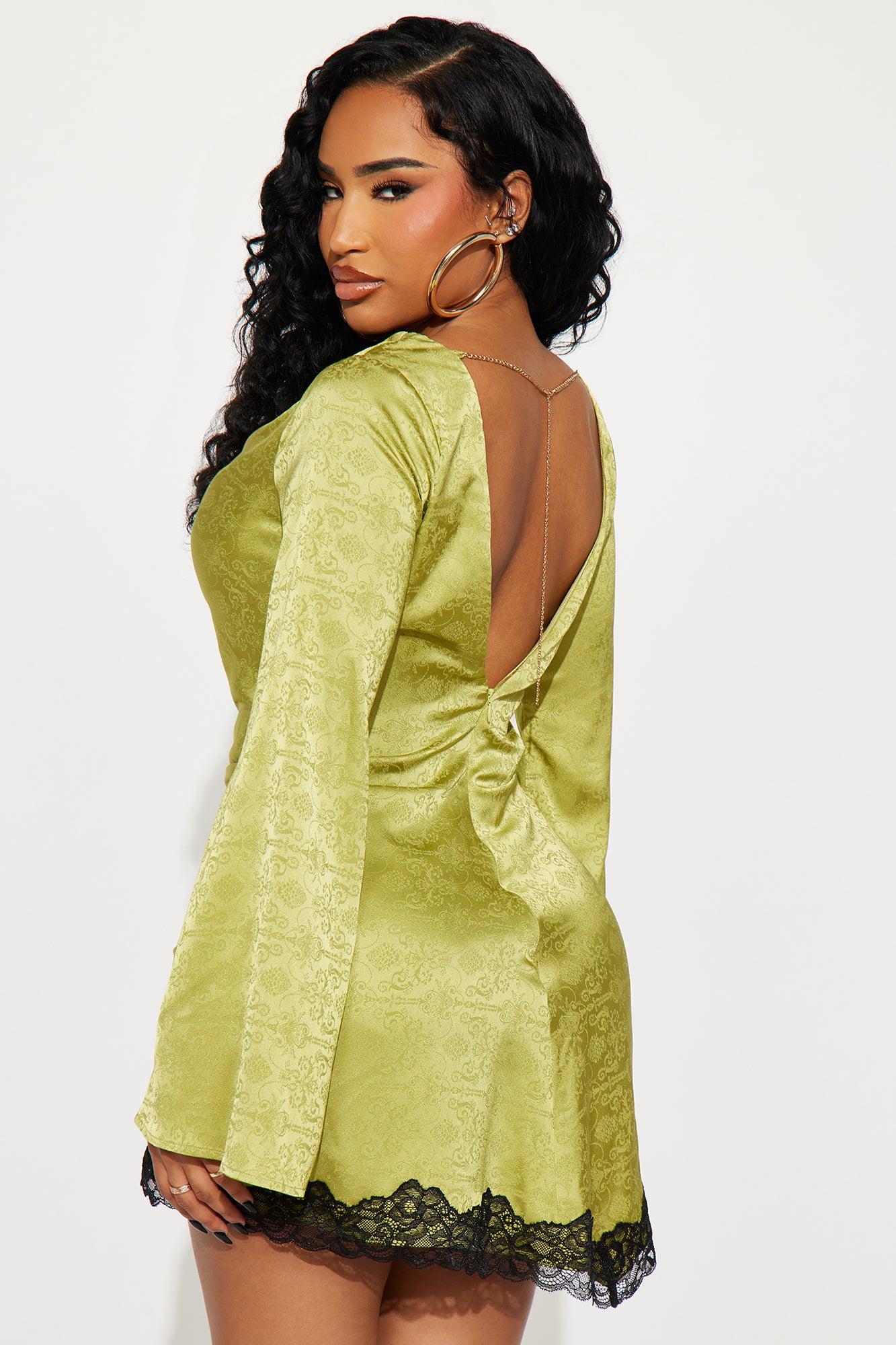 Available In Sage. Satin Mini Dress Cowl Neckline Long Sleeve Lace Trim Hardware Tie Back Open Back Back Zipper Lined Length Measured Flat = 32" Tall is 2" Longer Than Regular Length Self : 95% Polyester 5% Spandex Contrast : 100% Polyester Lining : 100% Polyester Imported California Proposition 65WARNING: Cancer and Reproductive Harm - www.P65Warnings.ca.gov.